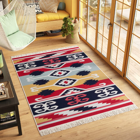 Dywan AztecaBawełniany Czerwony Niebieski z Frędzlami