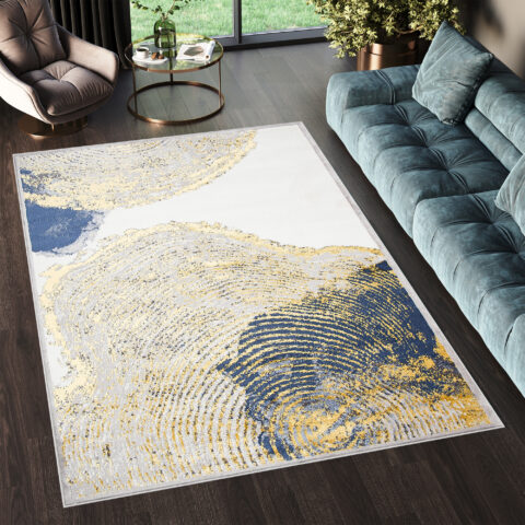 Dywan ShineKremowy Złoty Niebieski Abstrakcyjny Efekt 3D
