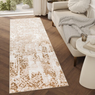 Wzór chodnika jest utrzymany w stonowanej kolorystyce beżów i brązów, co nadaje wnętrzu elegancji i ciepła, a jednocześnie wpisuje się w najnowsze trendy aranżacyjne. Dzięki swojej odporności na zabrudzenia oraz łatwości w pielęgnacji, chodnik ten sprawdzi się zarówno w domach z dziećmi, jak i zwierzętami.