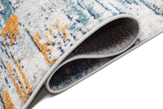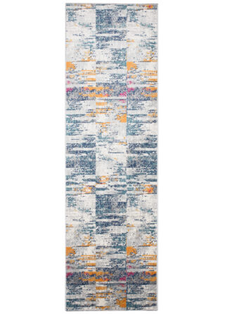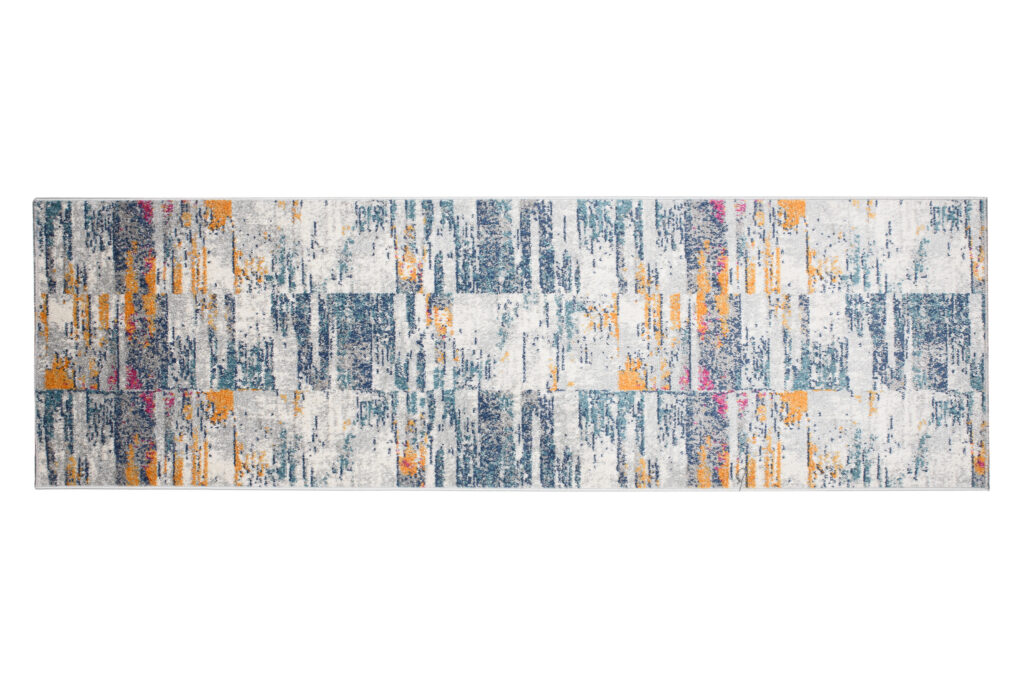 Postaw na design inspirowany rytmem miasta z chodnikiem Lazur, który łączy nowoczesny styl z wygodą codziennego użytkowania. Geometryczny wzór w formie nieregularnych pasów i bloków kolorystycznych tworzy dynamiczną kompozycję w odcieniach szarości, granatu, turkusu, musztardowego i bordo – idealną do wnętrz z charakterem.