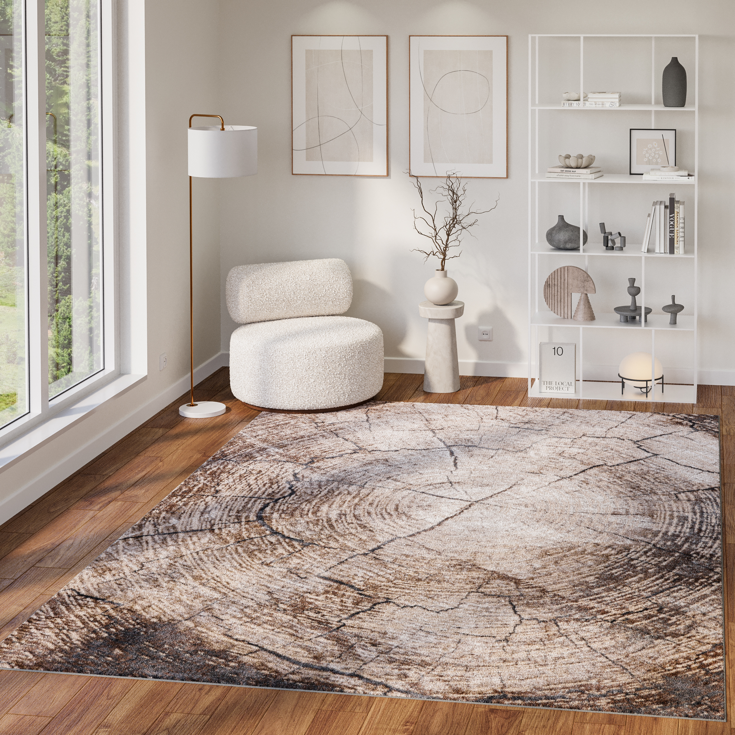 Wzór przypominający przekrój pnia drzewa, w naturalnych odcieniach brązu, beżu i kremu, wnosi do wnętrza ciepło oraz unikalny, inspirowany naturą styl, doskonale wpisując się w różnorodne aranżacje.