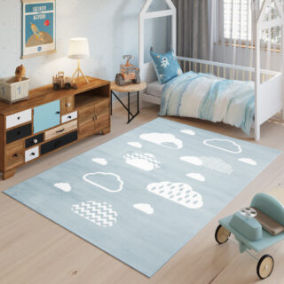 Stwórz spokojną i przytulną przestrzeń dla swojego dziecka dzięki dywanowi z motywem białych chmurek na pastelowym błękitnym tle. Ten krótko strzyżony dywan jest wyjątkowo łatwy do czyszczenia, co czyni go praktycznym wyborem do pokoju dziecięcego. Posiada certyfikat OEKO-TEX, co gwarantuje, że jest wykonany z materiałów bezpiecznych dla zdrowia najmłodszych.