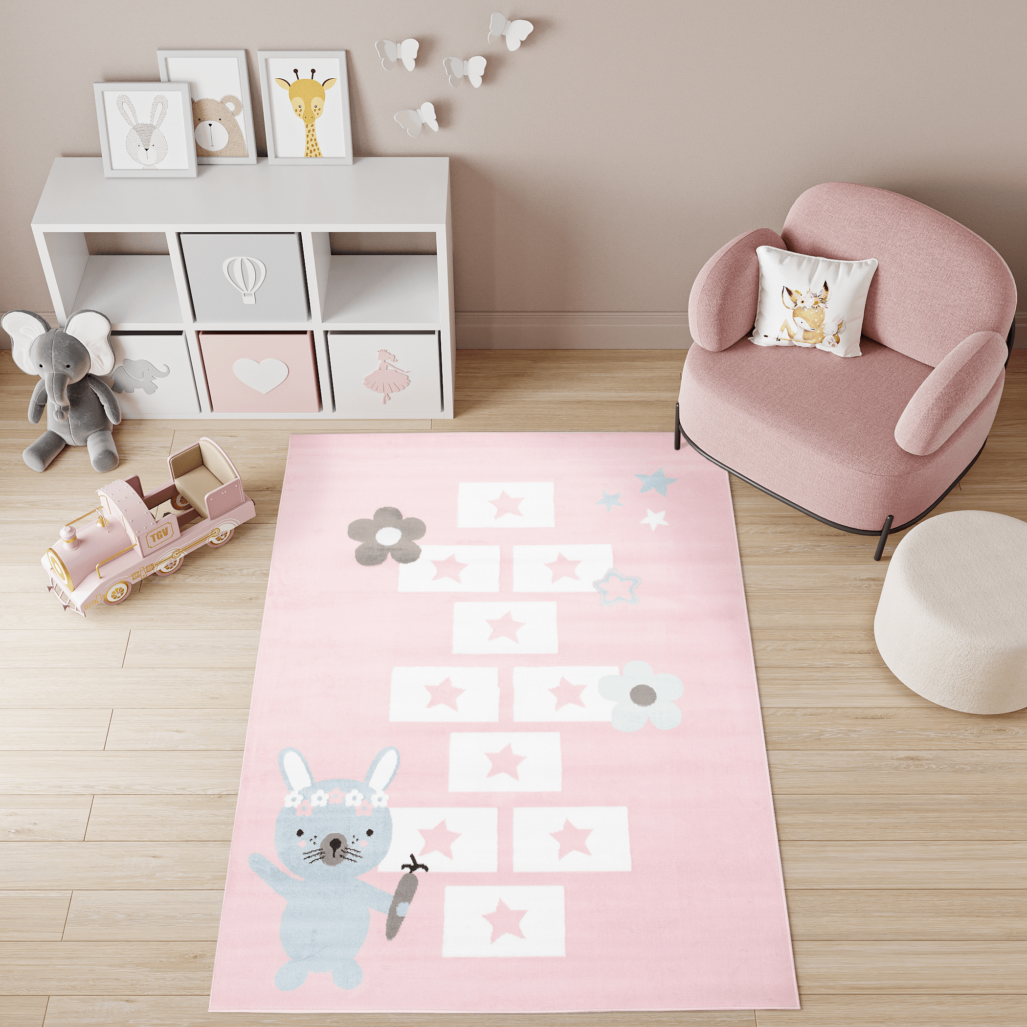 Dywan dziecięcy z motywem klasy i uroczym króliczkiem w pastelowym różu – idealny do zabawy i dekoracji