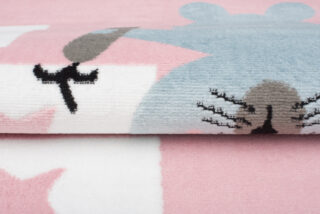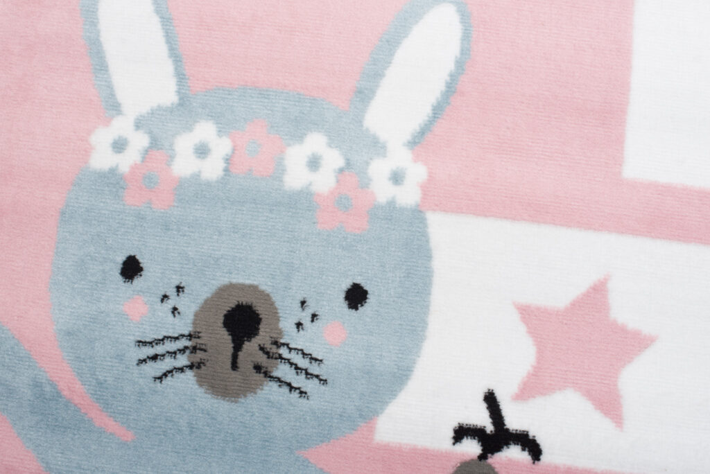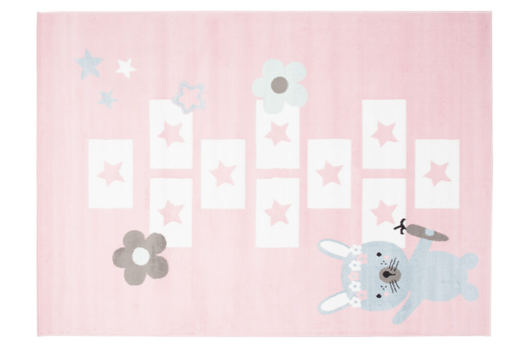 Dywan doskonale wpasuje się w pokoje o stylu skandynawskim, nowoczesnym lub vintage, gdzie dominują jasne i pastelowe kolory. Delikatny róż idealnie komponuje się z bielą, szarością oraz dodatkami w odcieniach błękitu. Wzór klasy z gwiazdkami oraz sympatyczny króliczek dodają wnętrzu dziecięcego uroku, zachęcając do zabawy i rozwijania wyobraźni.