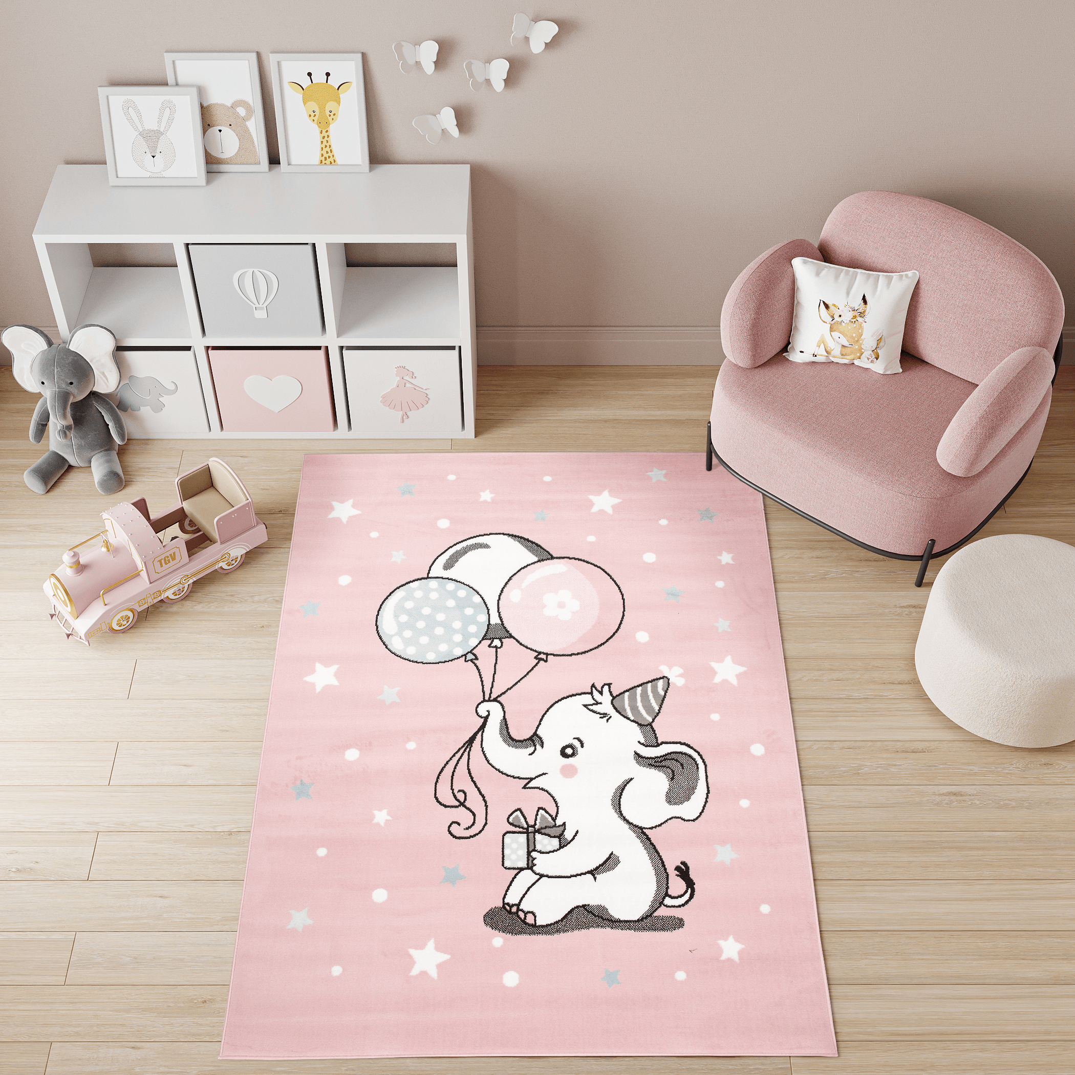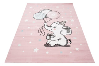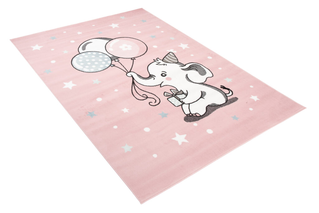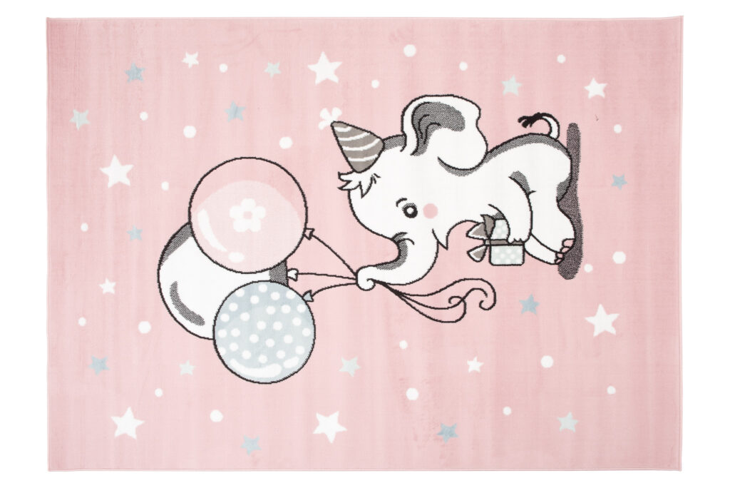 Dywan dziecięcy z motywem słonika i balonów na pastelowym różu – idealny do pokoju małej księżniczki