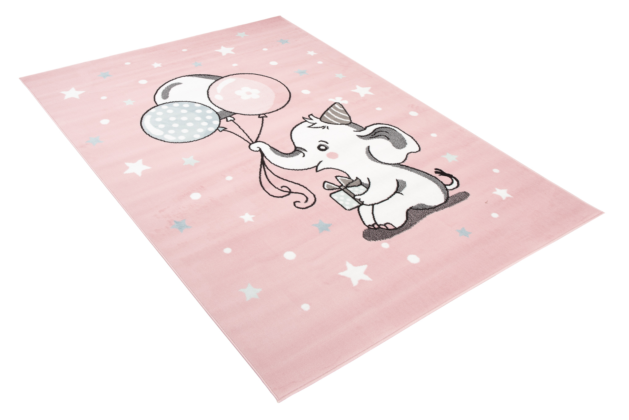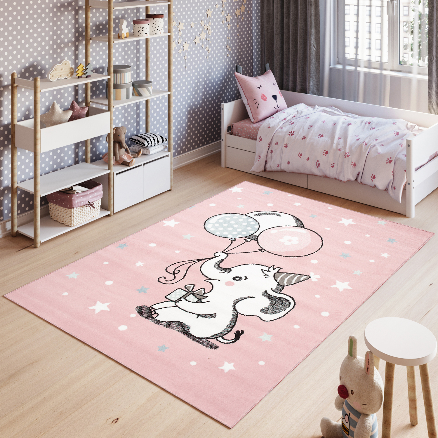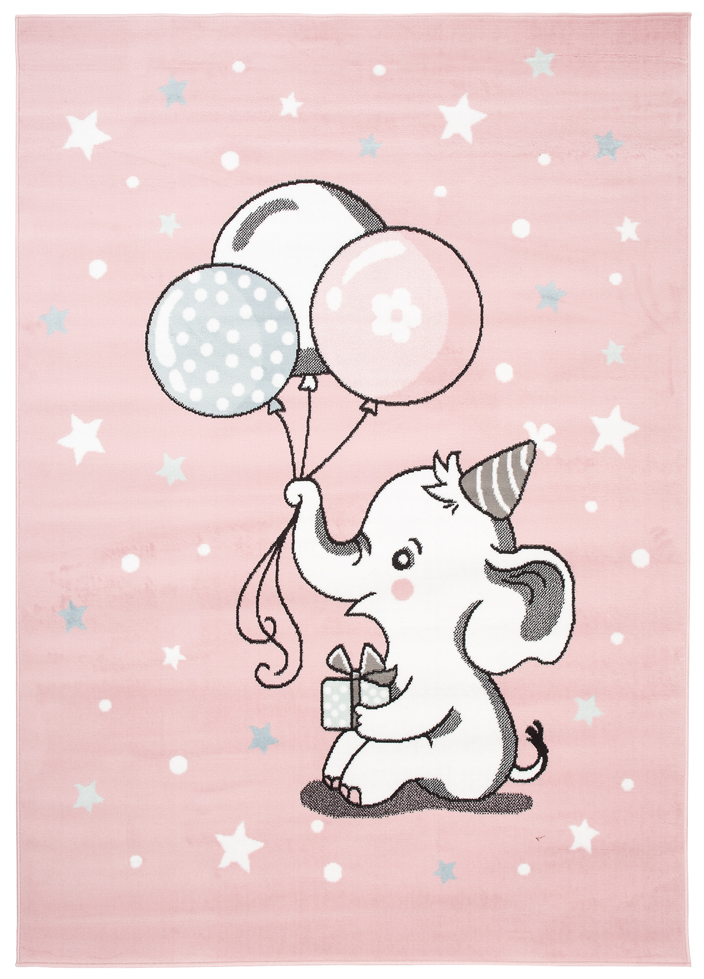 Dywan dziecięcy z motywem słonika i balonów na pastelowym różu – idealny do pokoju małej księżniczki