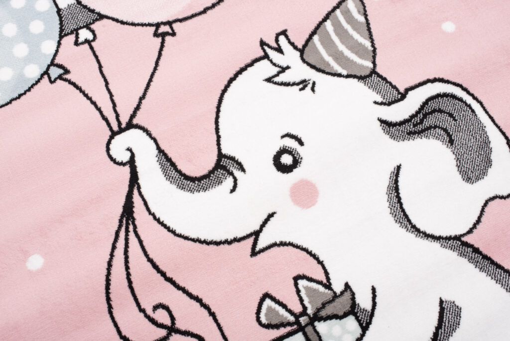 Dywan ten doskonale sprawdzi się w pokoju urządzonym w stylu skandynawskim, vintage lub klasycznym, w którym dominują jasne, pastelowe kolory. Jego delikatny róż świetnie komponuje się z białymi, szarymi oraz kremowymi meblami, a także dodatkami w odcieniach błękitu czy mięty. Wesoły motyw słonika z balonami i prezentem sprawi, że pokój stanie się przytulny i pełen dziecięcego uroku, idealny do zabawy i relaksu.