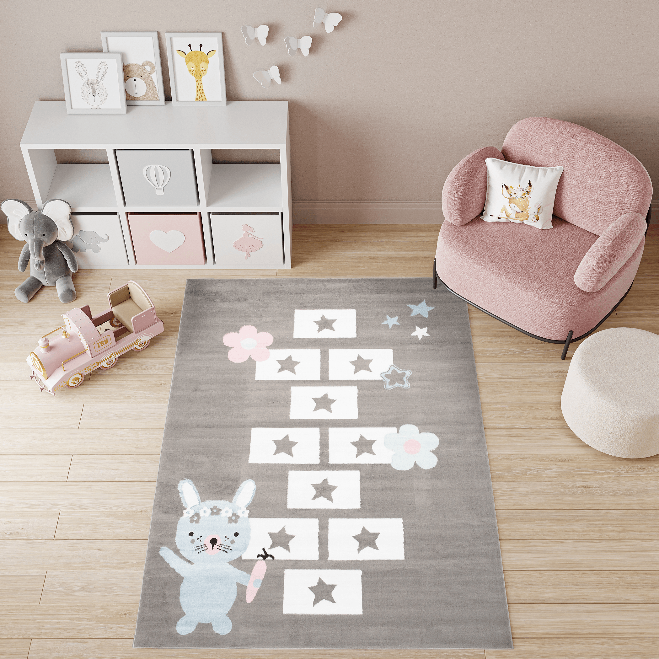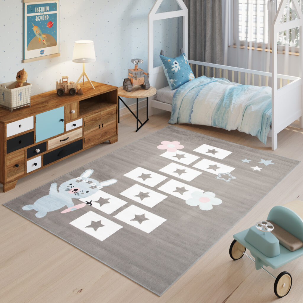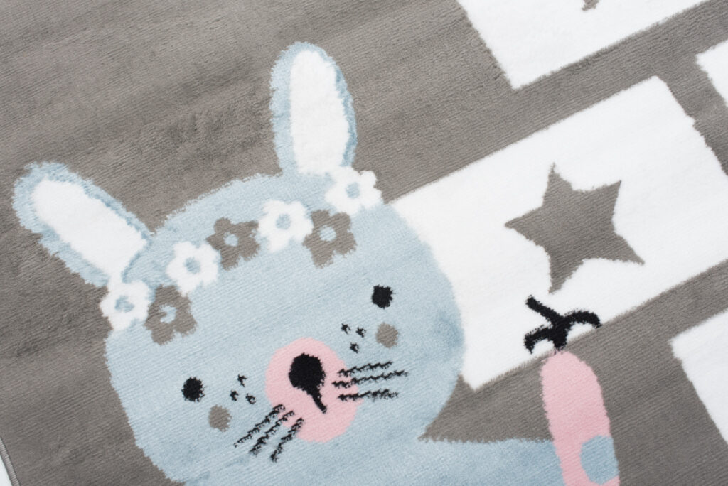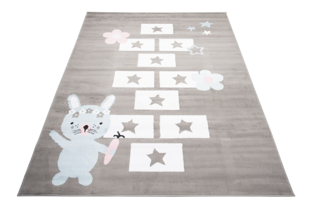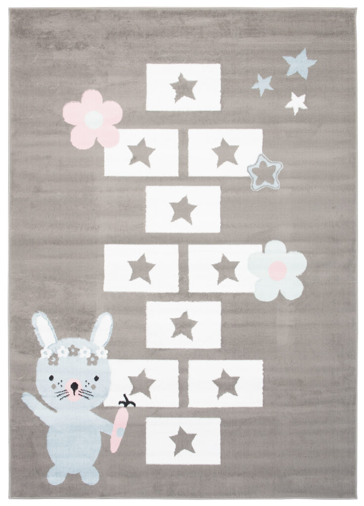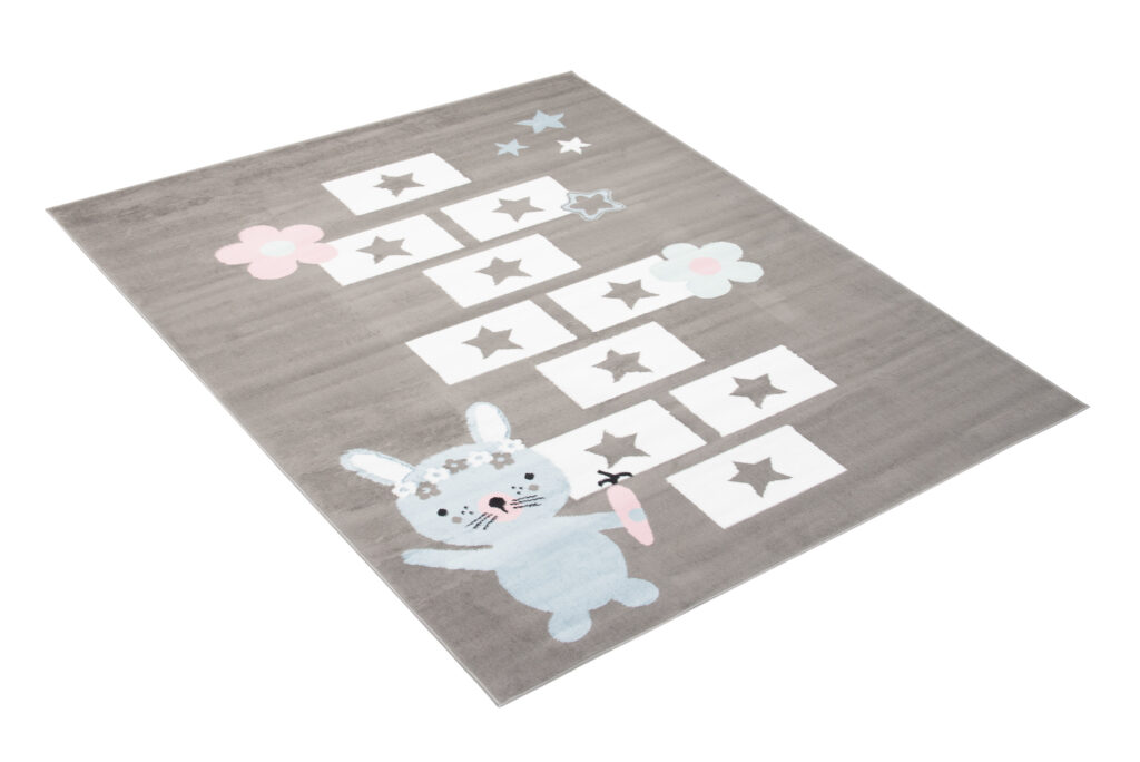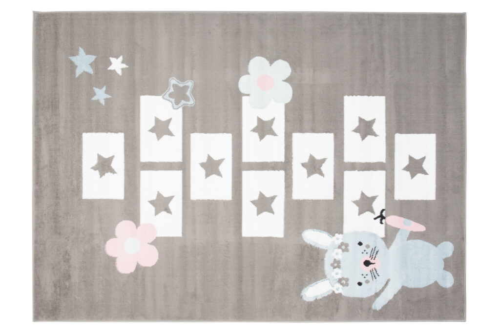 Dywan ten doskonale pasuje do pokoju w stylu skandynawskim, nowoczesnym lub minimalistycznym, gdzie dominują pastelowe i jasne kolory. Jego neutralne, szare tło pięknie współgra z bielą, różem i błękitem, co tworzy przytulną, harmonijną przestrzeń. Zabawa w klasy na tym dywanie rozwija kreatywność i aktywność dziecka, a motyw uroczego króliczka dodaje wnętrzu dziecięcego uroku.