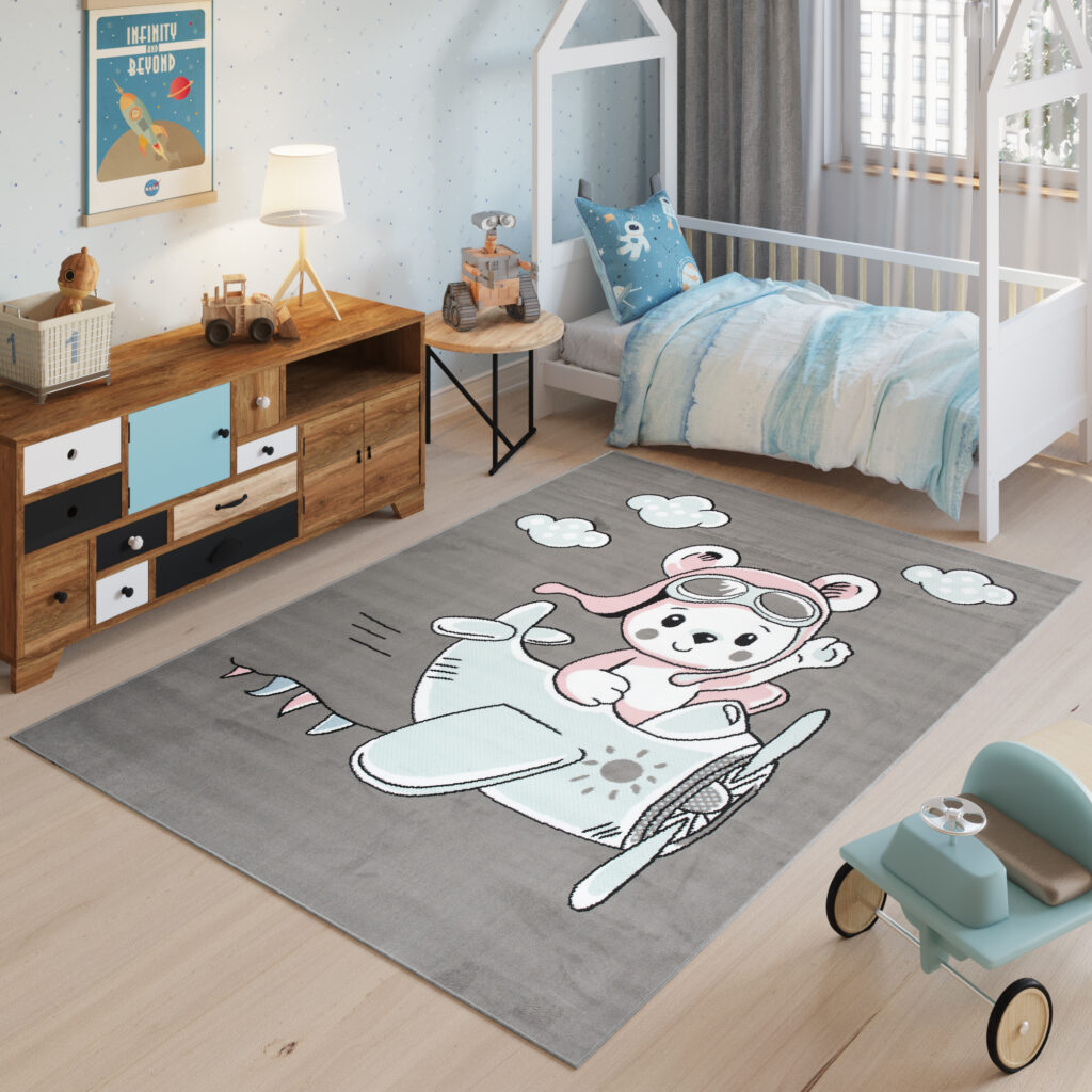 Dywan dziecięcy z motywem misia w samolocie – idealny do pokoju małego marzyciela