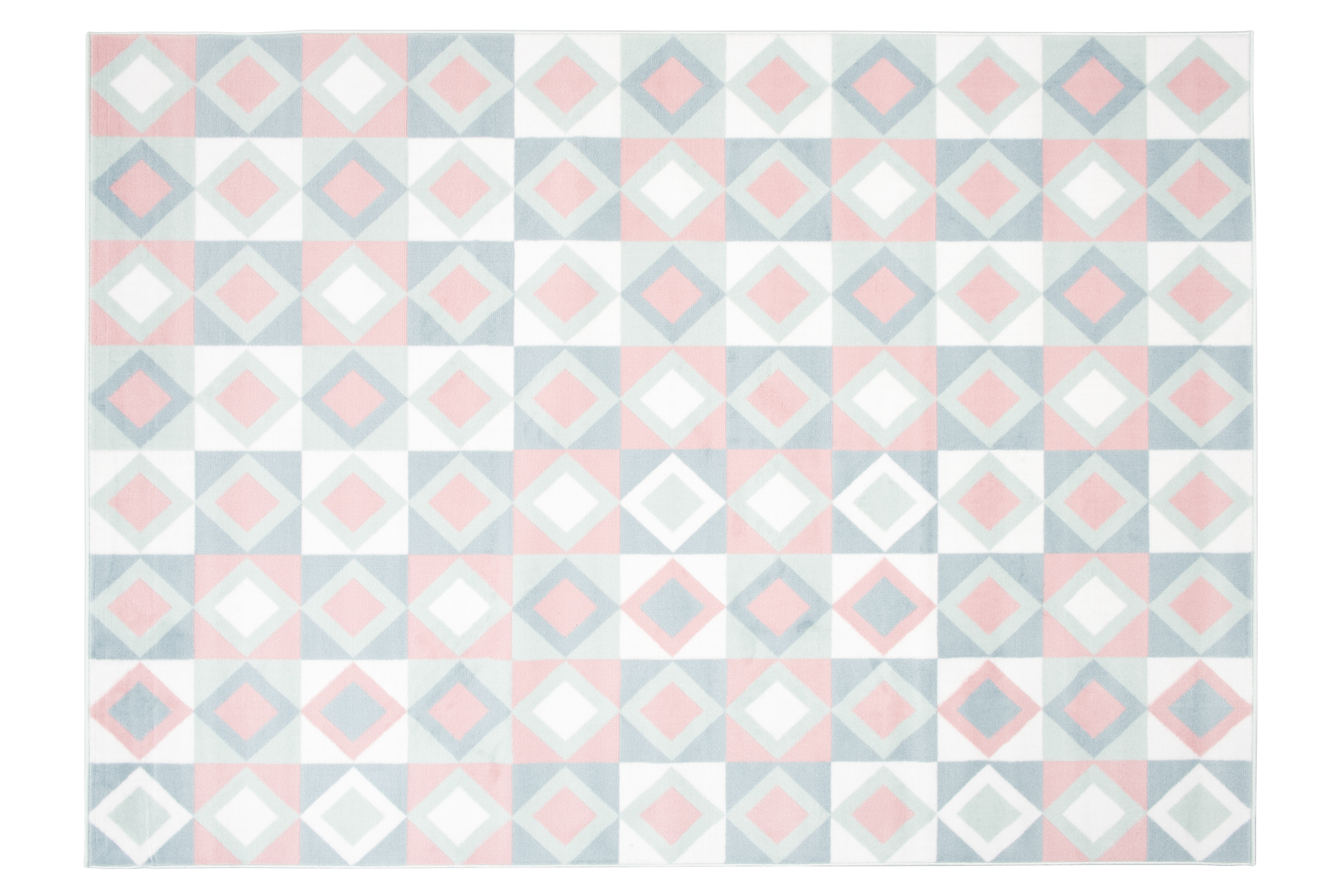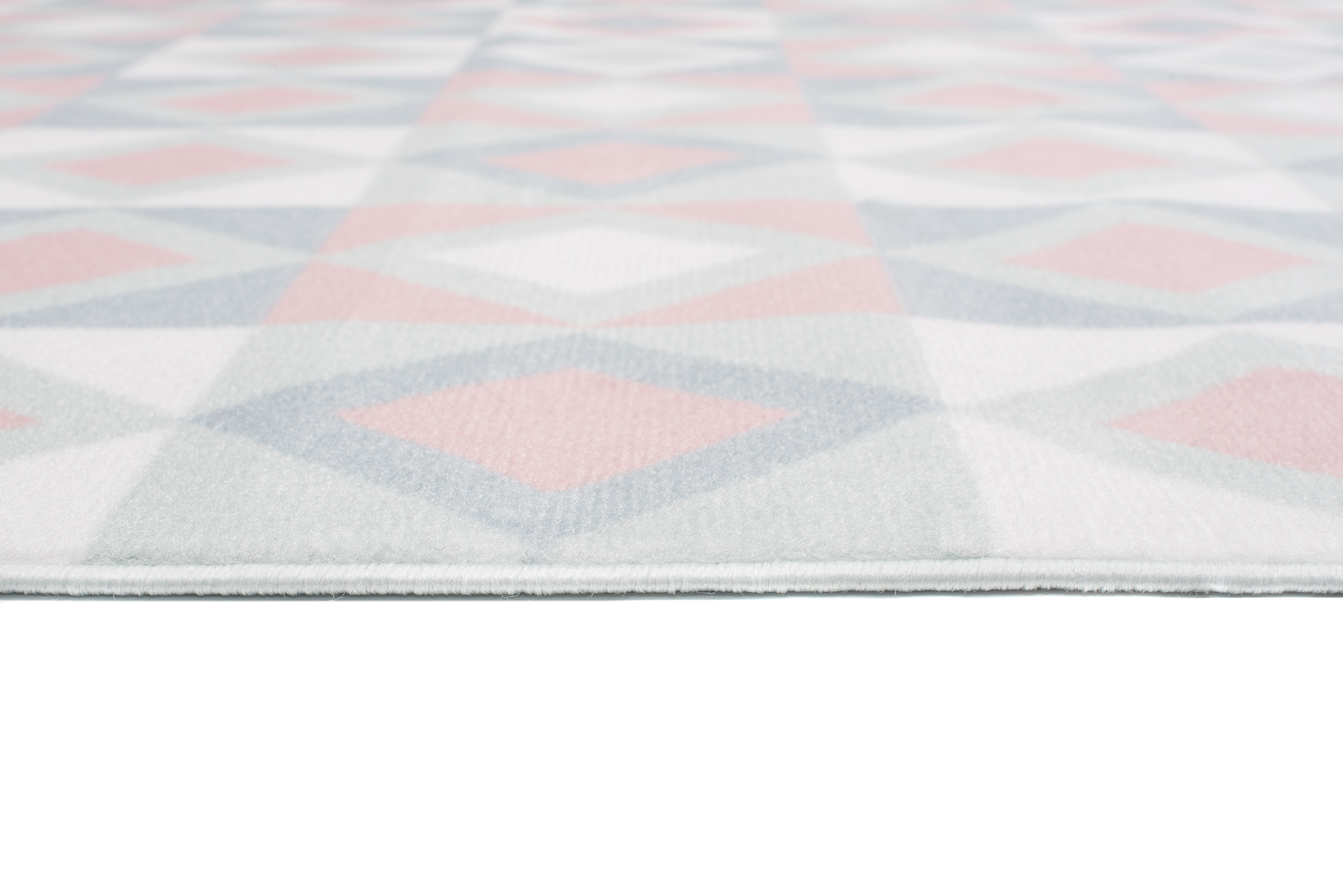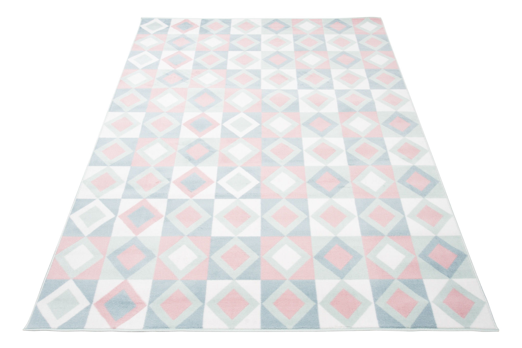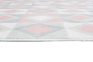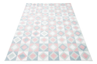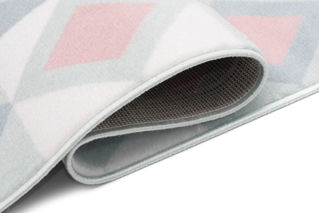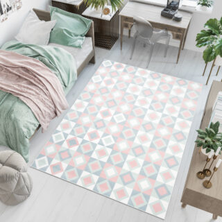 Dywan świetnie sprawdzi się w pokojach urządzonych w stylu skandynawskim, nowoczesnym lub minimalistycznym. Jego pastelowa kolorystyka i geometryczny wzór wprowadzają lekkość i elegancję, doskonale komponując się z jasnymi meblami oraz dodatkami w odcieniach bieli, szarości lub beżu. Wzór w romby nadaje wnętrzu nowoczesnego charakteru, ale jest na tyle subtelny, że pasuje do przytulnych, dziecięcych aranżacji.