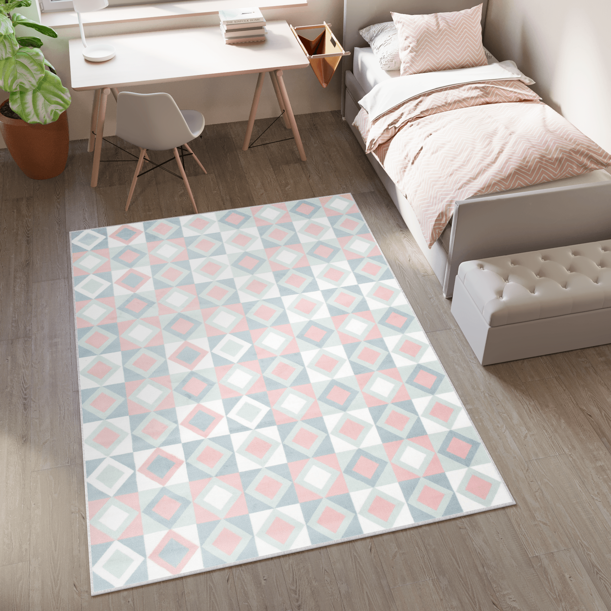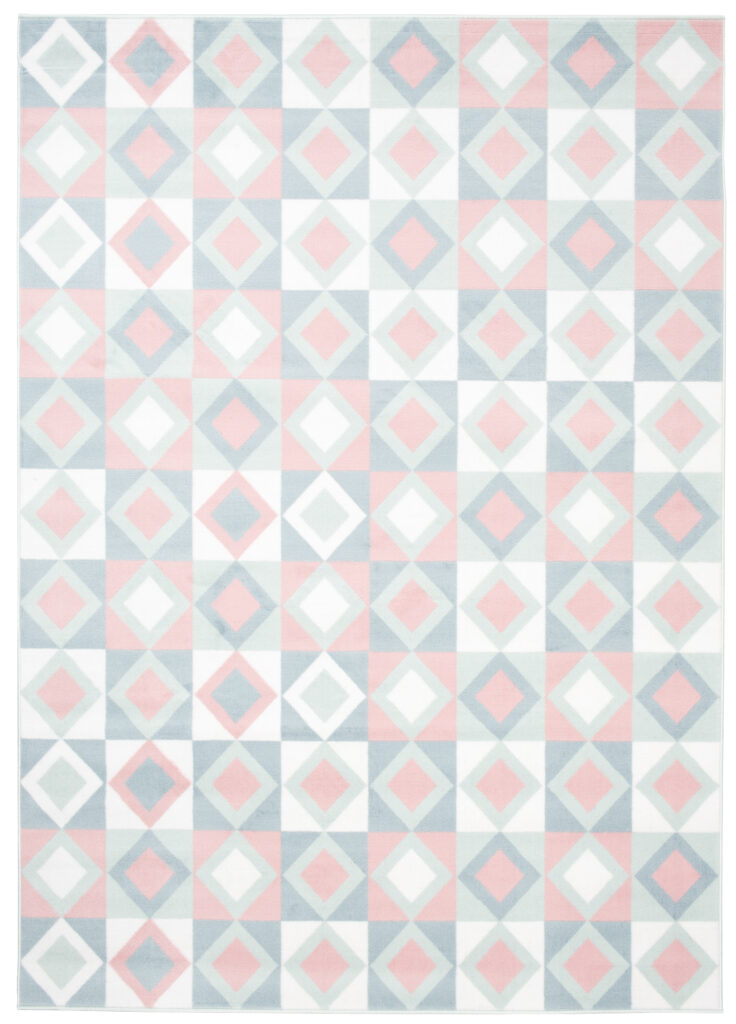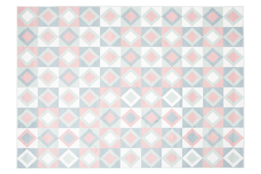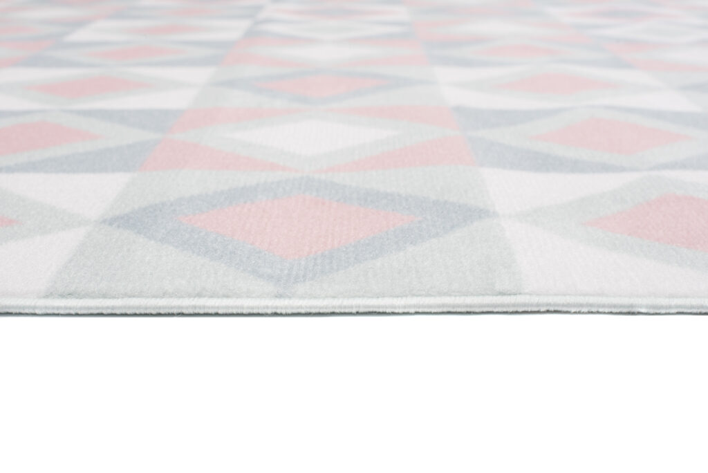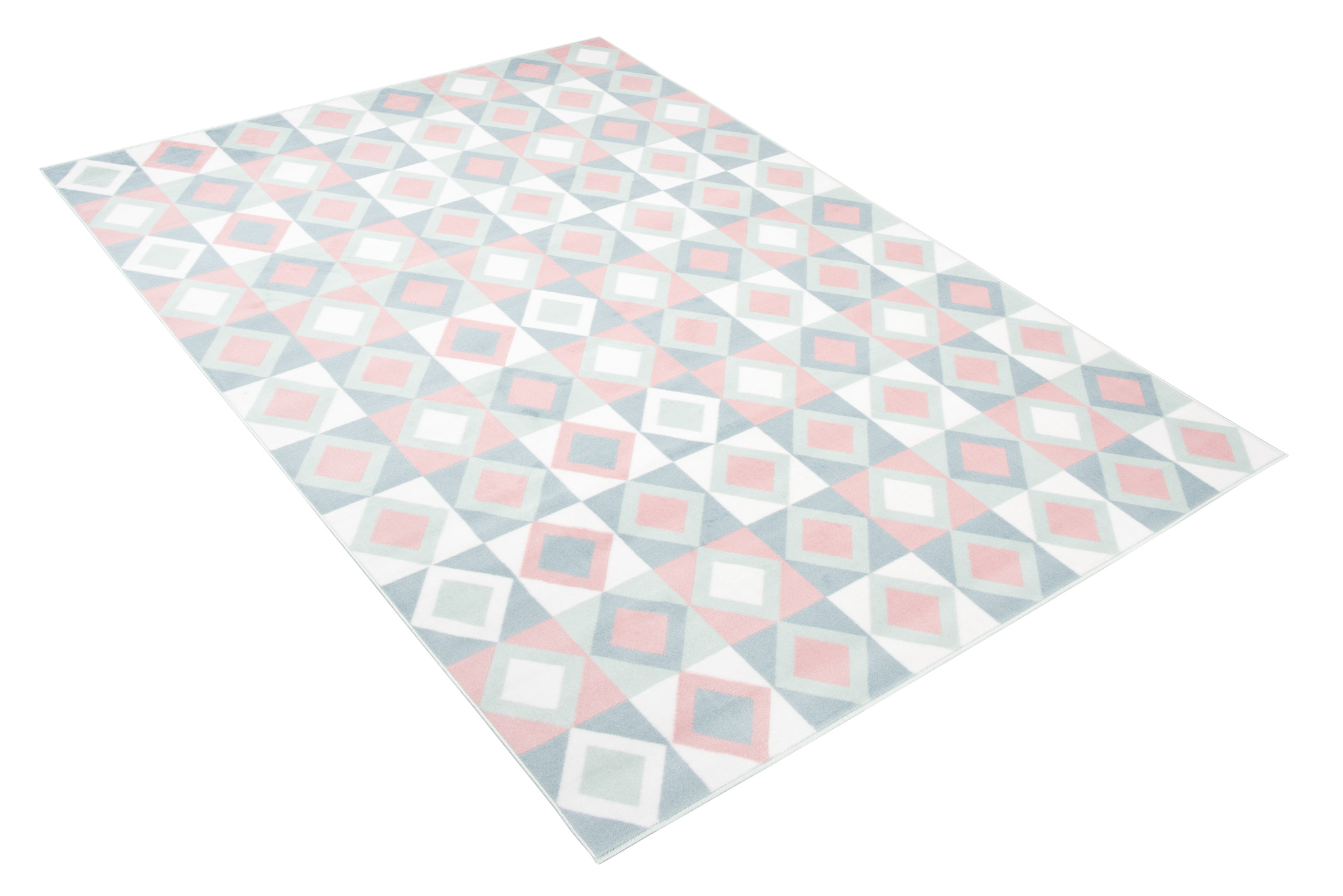 Dywan świetnie sprawdzi się w pokojach urządzonych w stylu skandynawskim, nowoczesnym lub minimalistycznym. Jego pastelowa kolorystyka i geometryczny wzór wprowadzają lekkość i elegancję, doskonale komponując się z jasnymi meblami oraz dodatkami w odcieniach bieli, szarości lub beżu. Wzór w romby nadaje wnętrzu nowoczesnego charakteru, ale jest na tyle subtelny, że pasuje do przytulnych, dziecięcych aranżacji.