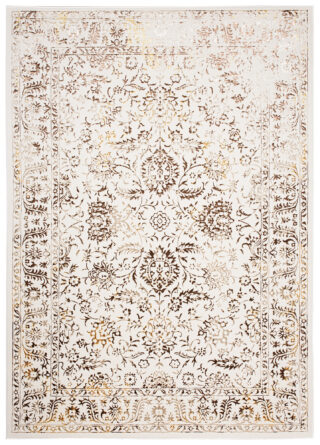 Ten kremowo-złoty dywan w stylu vintage to elegancka propozycja, która wnosi do wnętrza ciepło i subtelny blask. Na kremowym tle delikatnie wyróżniają się złote akcenty oraz ozdobna ramka, tworząc efekt inspirowany klasycznymi dywanami, ale w nowoczesnej, rozświetlonej wersji. Taki kremowo-złoty dywan świetnie sprawdzi się we wnętrzach glamour i klasycznych, gdzie doda wyrafinowania i elegancji. Najlepiej wygląda na ciemnych podłogach, gdzie jego jasna kolorystyka i delikatny połysk pięknie kontrastują z tłem.