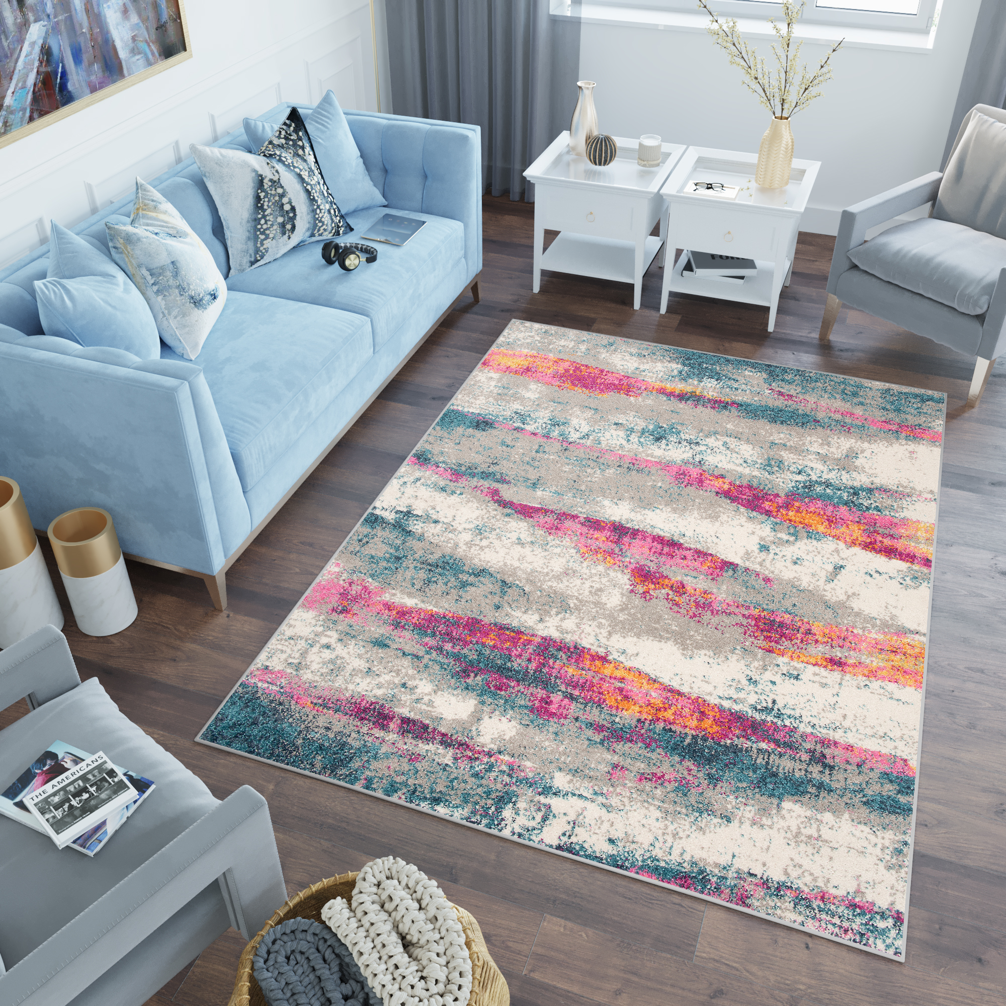 Ten wielokolorowy dywan z różowymi, pomarańczowymi i niebieskimi przetarciami nadaje wnętrzu artystyczny klimat. Połączenie subtelnych różowych tonów z wielokolorowymi akcentami tworzy dynamiczny, a zarazem harmonijny efekt, który doskonale ożywia przestrzeń, dodając jej przytulności. Dywan z abstrakcyjnym wzorem przetarć idealnie sprawdzi się w nowoczesnych oraz boho aranżacjach, gdzie stawia się na kreatywne detale i niebanalne akcenty.