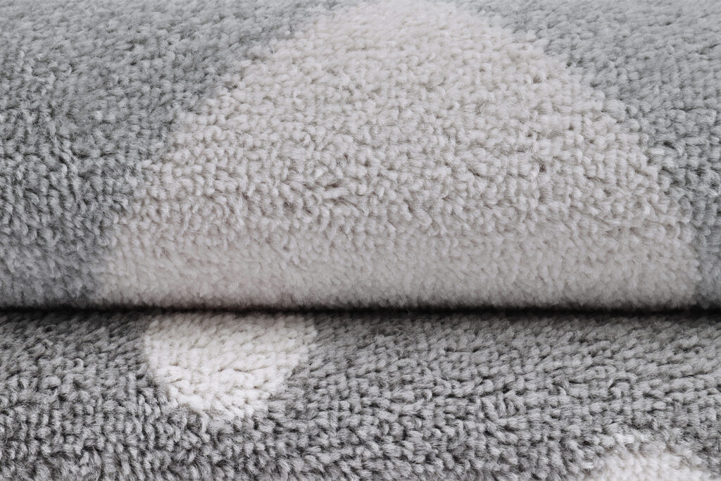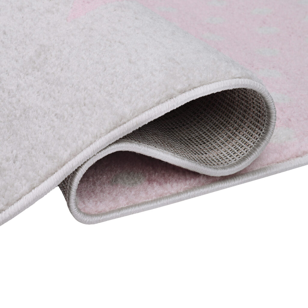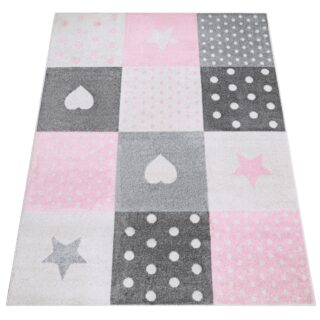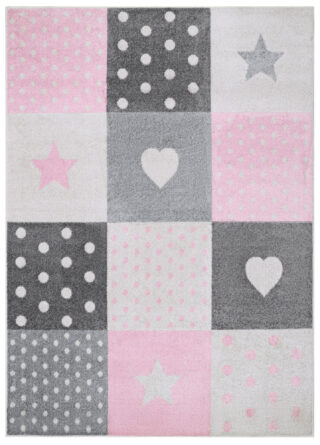 Szaro-różowy dywan z kwadratami sprawdzi się idealnie na jasnych podłogach, takich jak drewno czy panele w kolorze naturalnym lub bielonym, ale równie dobrze zaprezentuje się na ciemniejszym tle, tworząc wyrazisty kontrast. Dzięki miękkiej, przyjemnej w dotyku powierzchni, dywan jest praktycznym i estetycznym wyborem do pokoju dziecka.