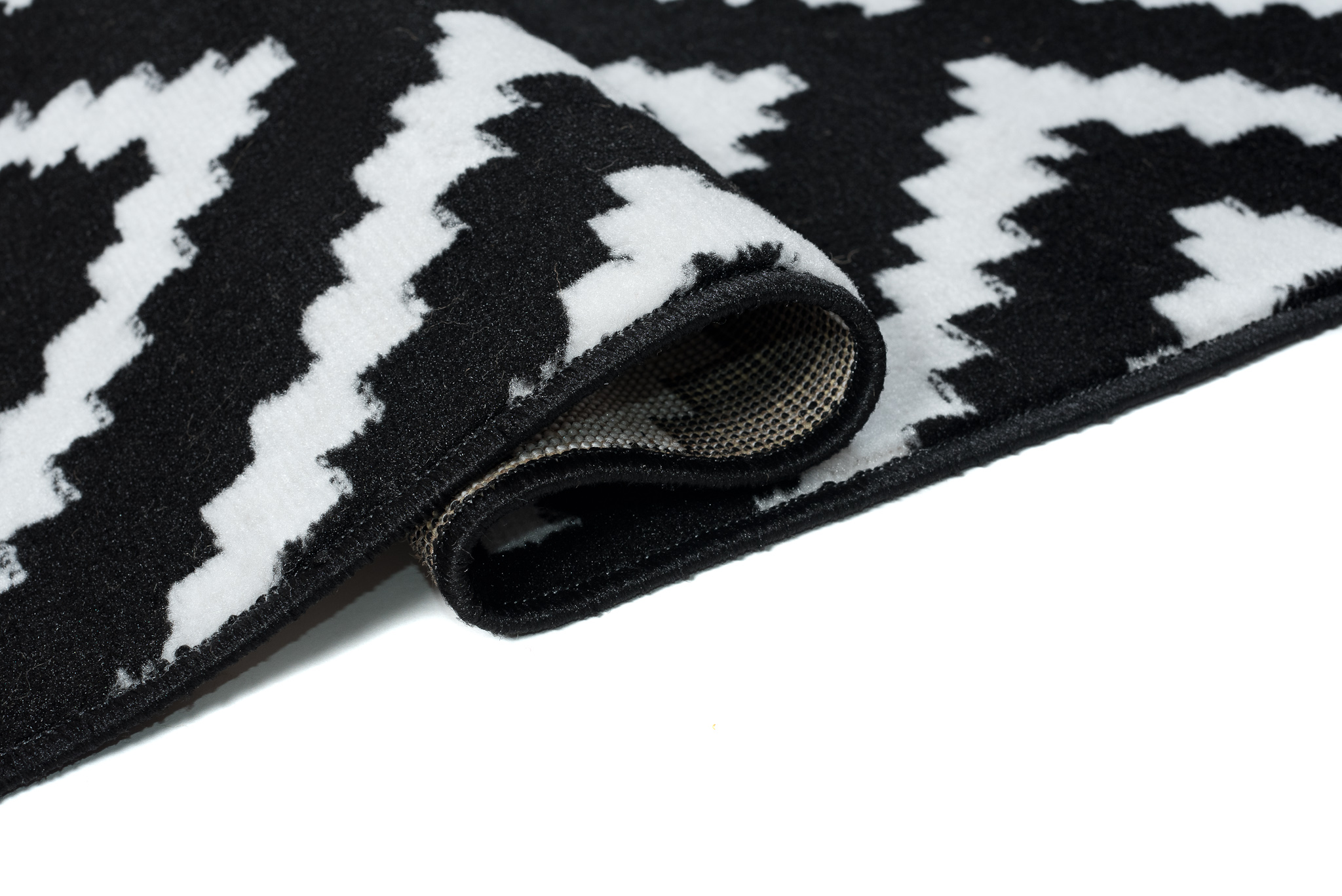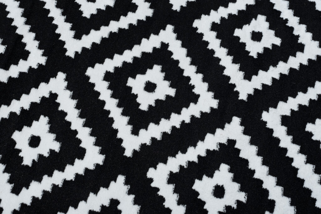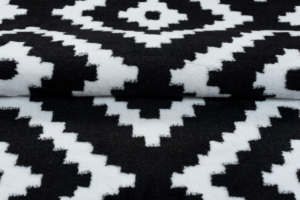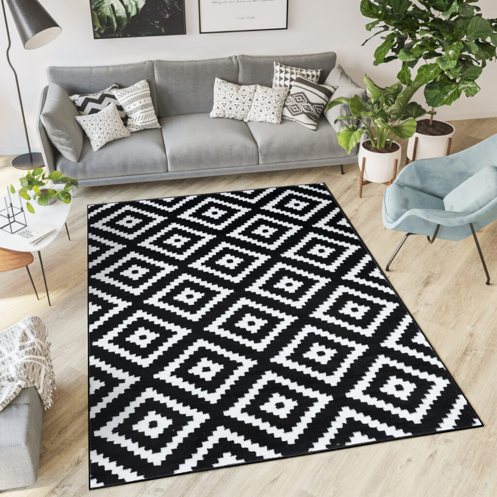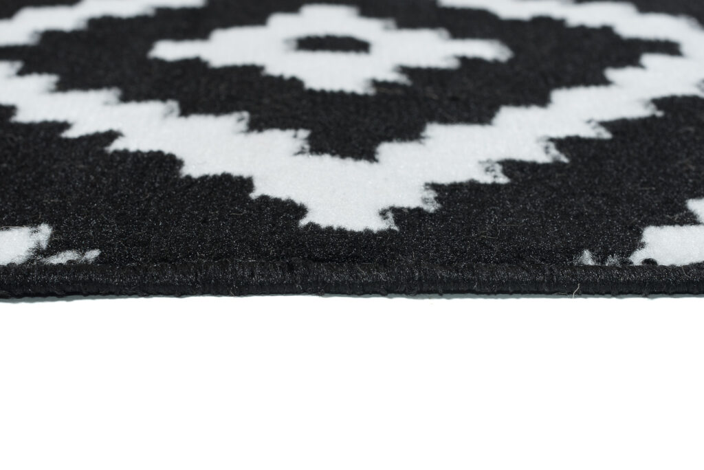 Najlepiej prezentuje się na jasnych podłogach, które podkreślają kontrast kolorów i nadają wnętrzu świeżości, choć równie interesująco wygląda na ciemnych powierzchniach. Wysoka jakość wykonania zapewnia jego trwałość. Taki dywan w czarno białe geometryczne wzory z pewnością szybko nie wyjdzie z mody.