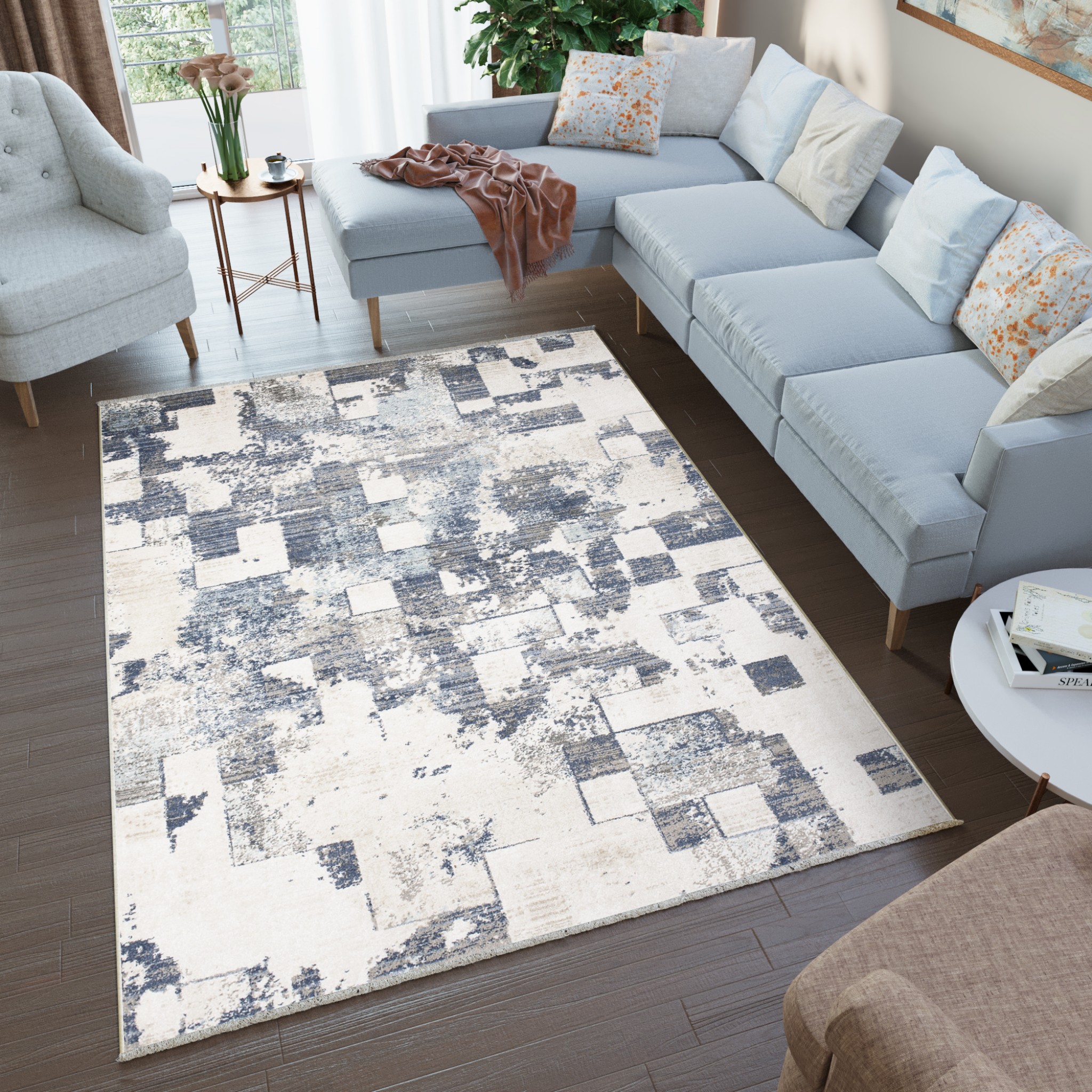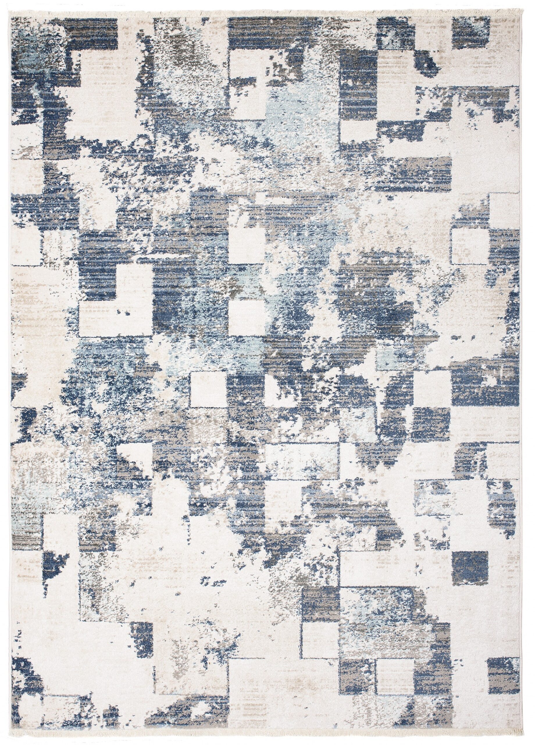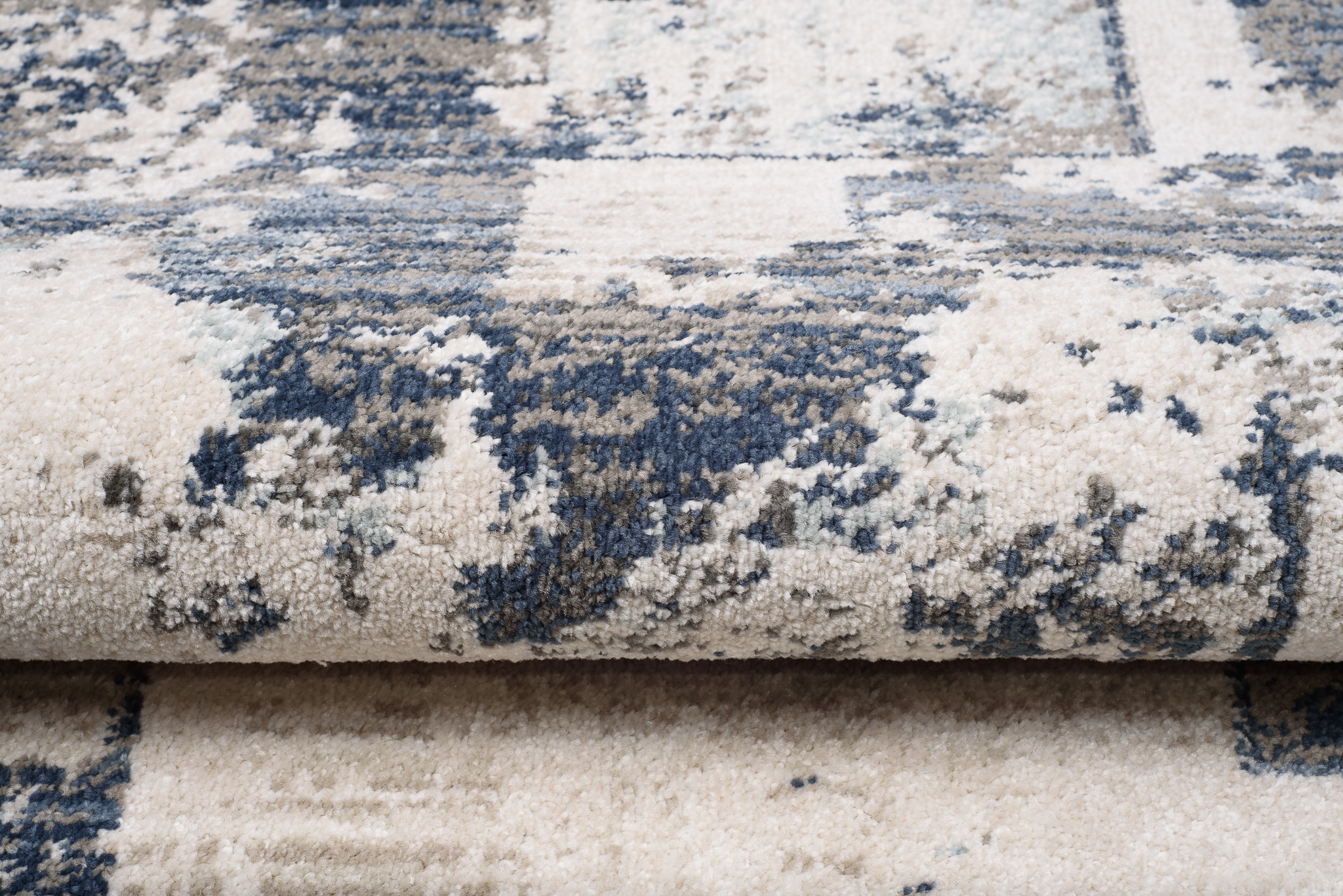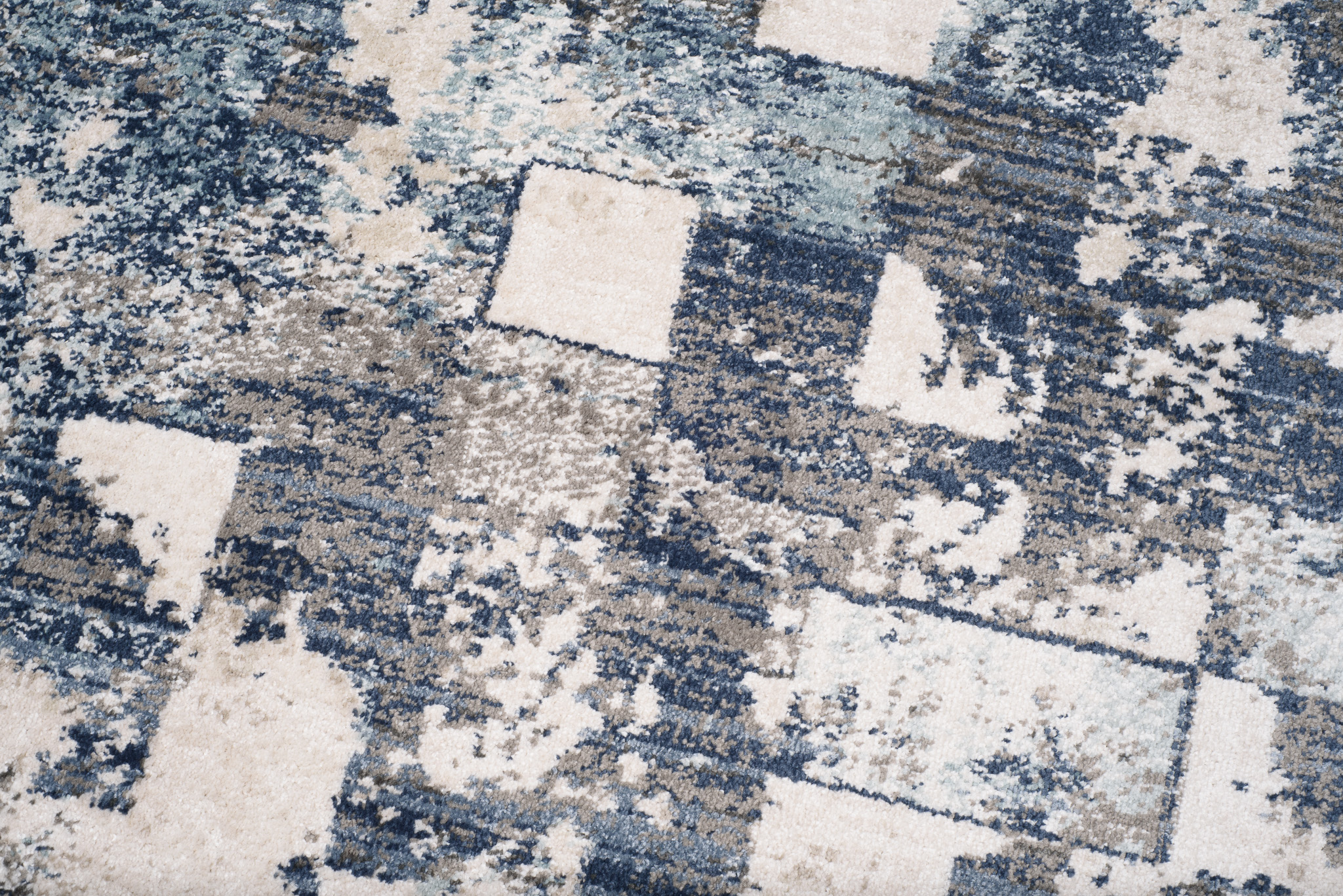 Dywan RivoliKremowy Niebieski Kwadraty Przetarcia z Frędzlami