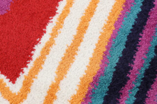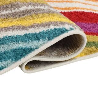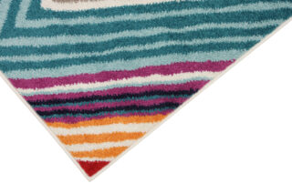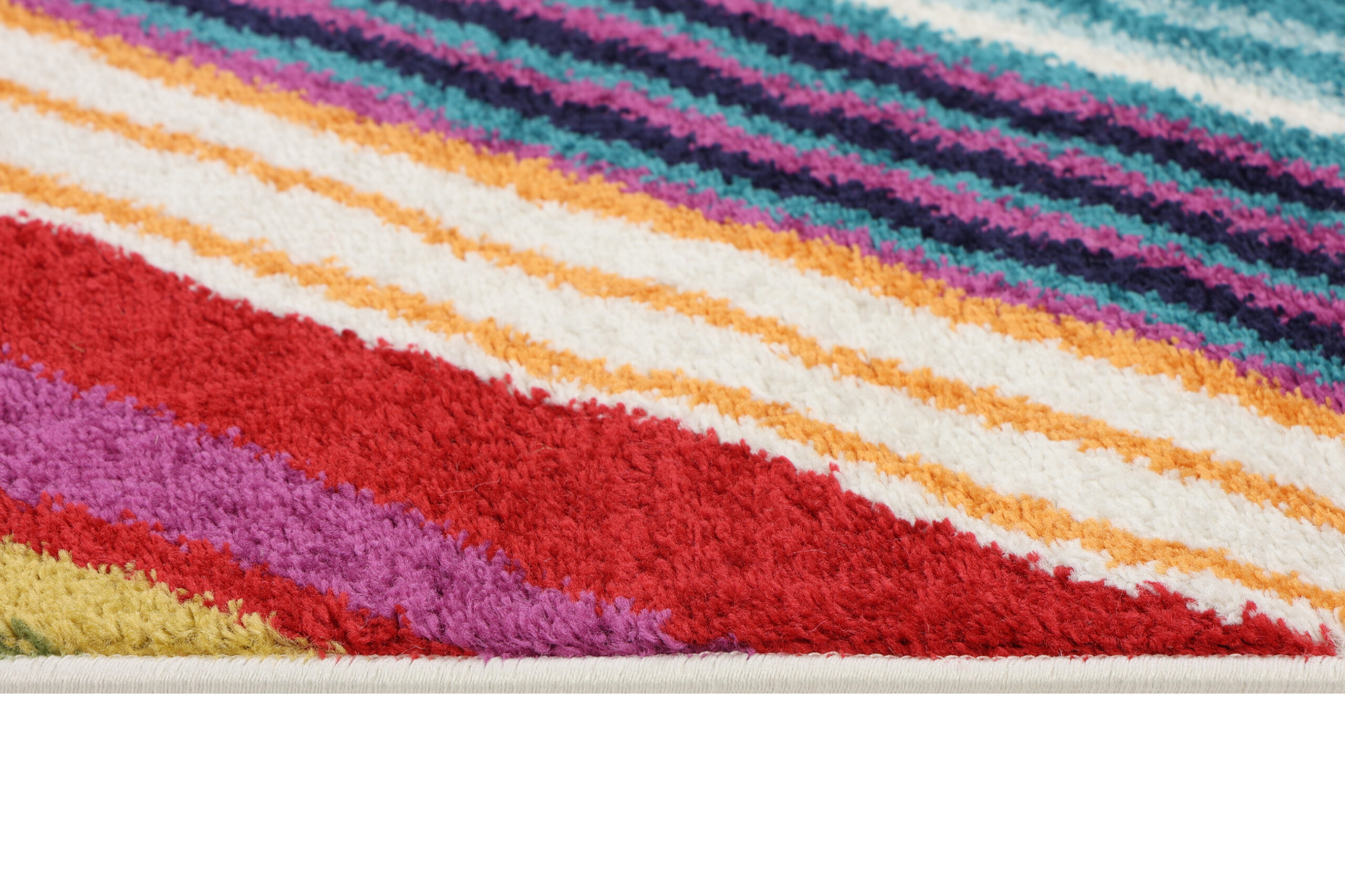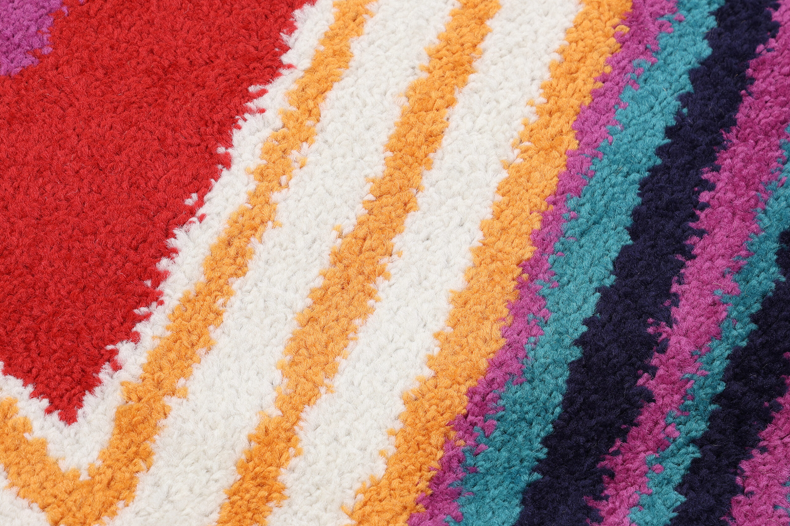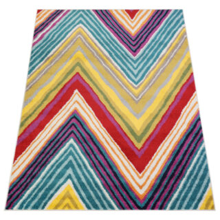 Wnieś do swojego wnętrza energię i barwy dzięki temu wielokolorowemu dywanowi z wyrazistym wzorem w zygzaki. Żywe kolory – turkusy, czerwienie, żółcie, fiolety i pomarańcze – układają się w dynamiczne pasy, które tworzą efektowną, geometryczną kompozycję. Miękkie włosie dywanu zapewnia wyjątkowy komfort, a jego odporność na zabrudzenia sprawia, że jest łatwy do czyszczenia, co czyni go idealnym wyborem do salonu, sypialni lub biura.