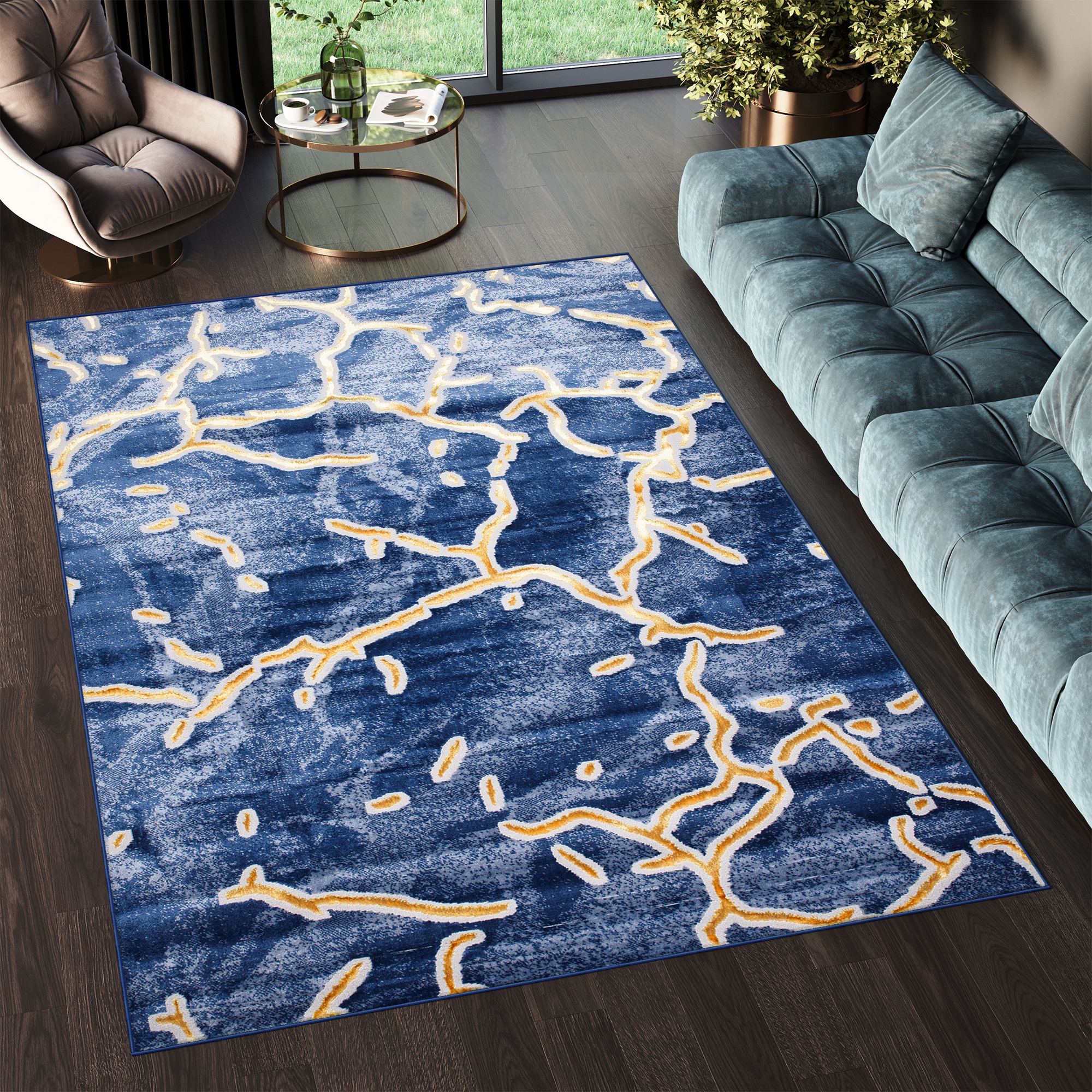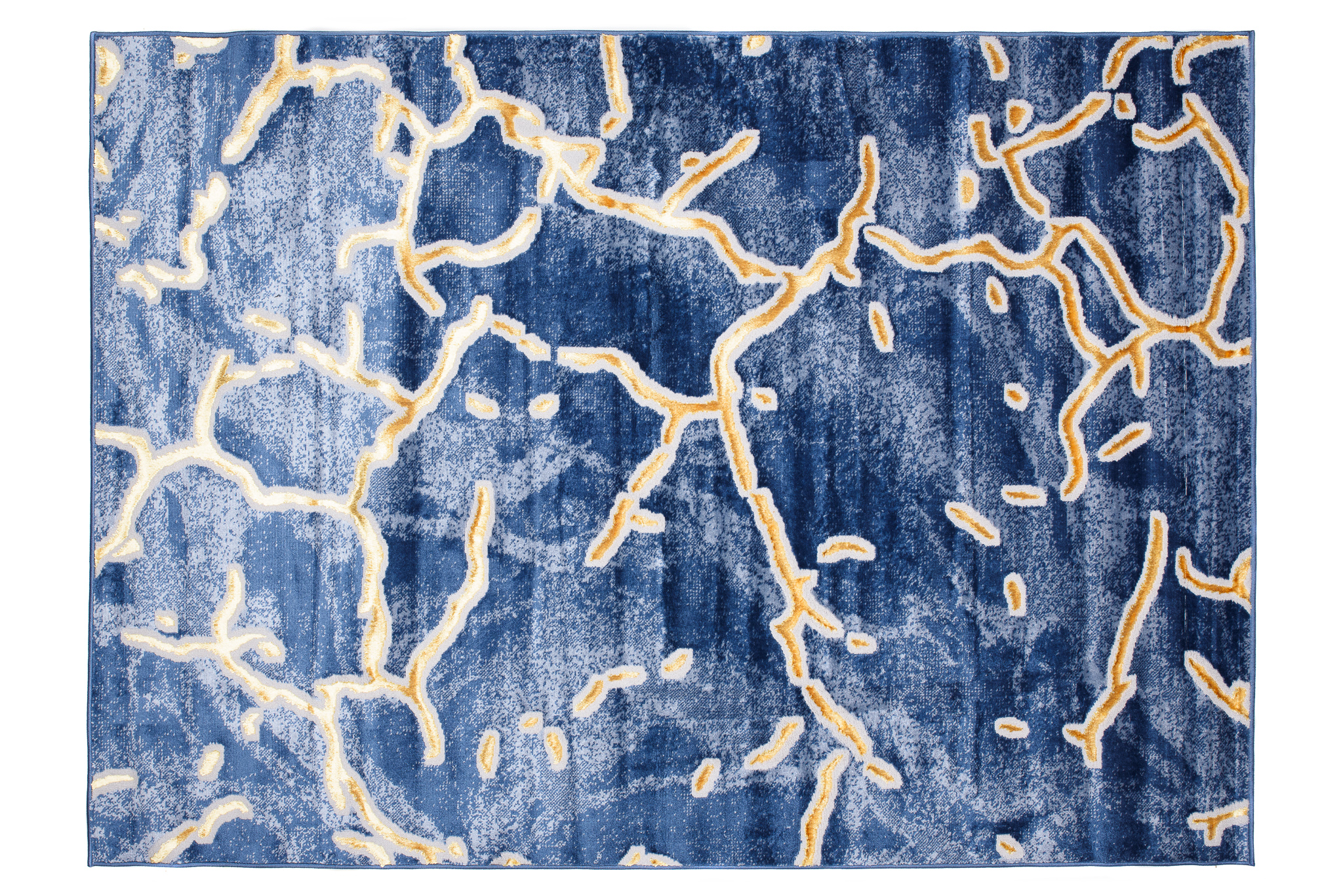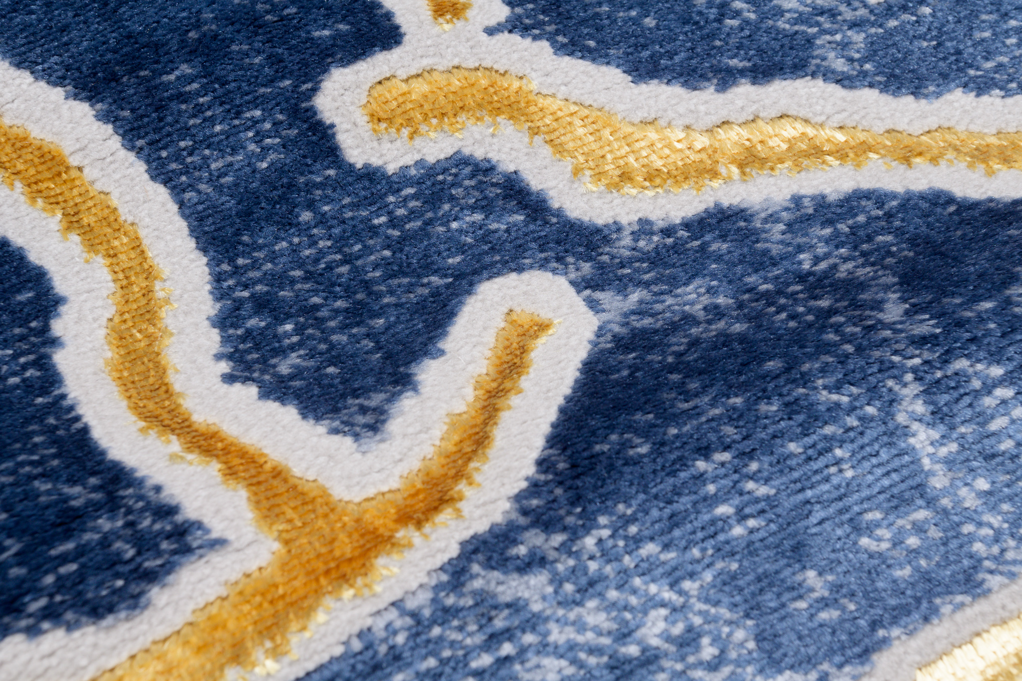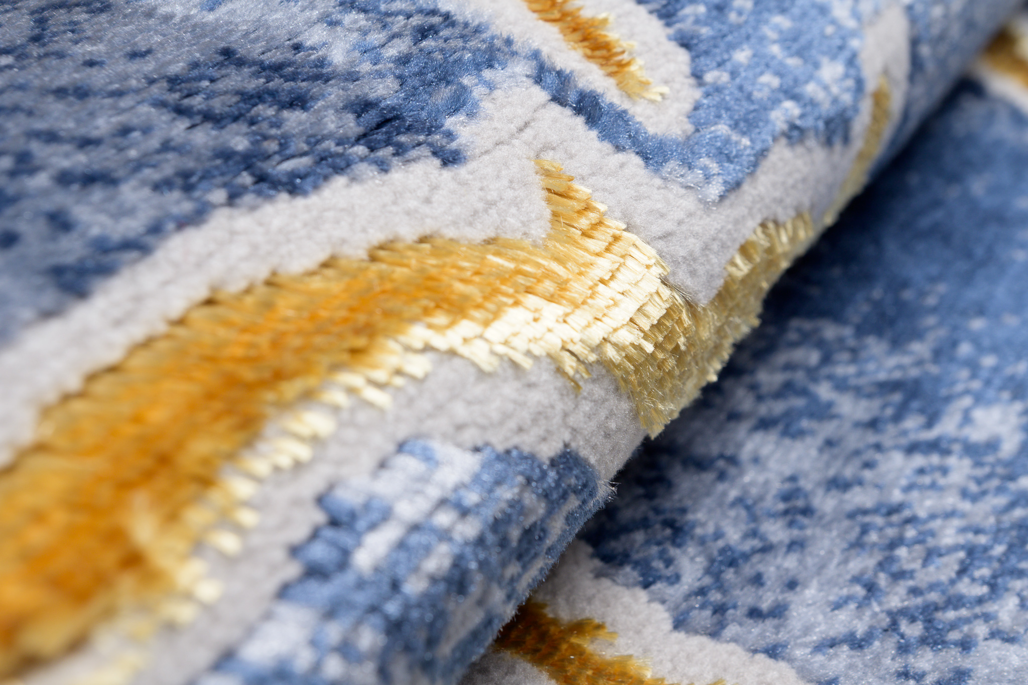 To, co wyróżnia tę kolekcję spośród innych, to abstrakcyjne wzory i subtelna złota nitka, która dodaje dywanom wyjątkowego blasku. Dominujące kolory kolekcji to głęboki szary, elegancki granatowy oraz luksusowy złoty, które harmonijnie łączą się ze sobą, tworząc przyciągający wzrok efekt wizualny.