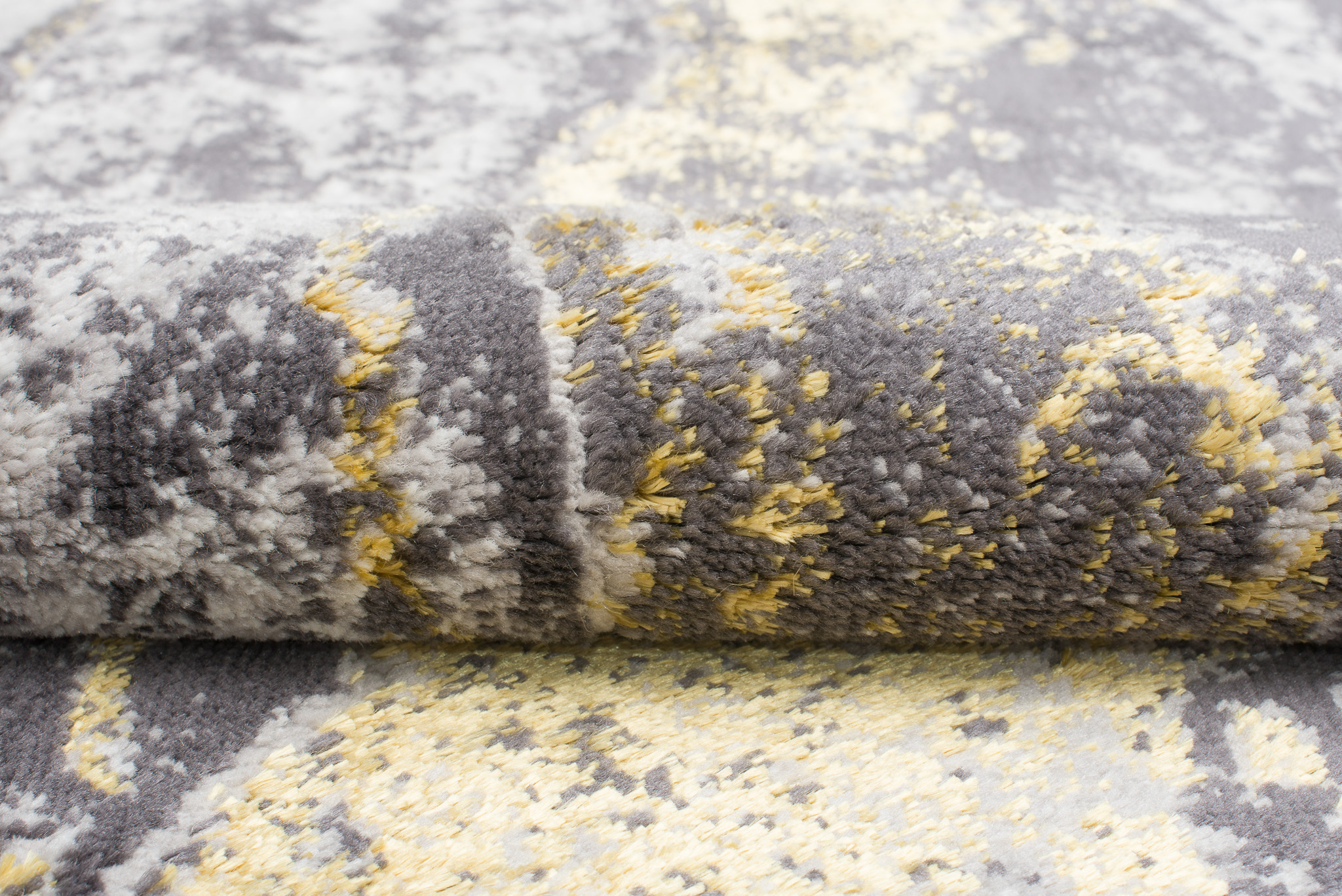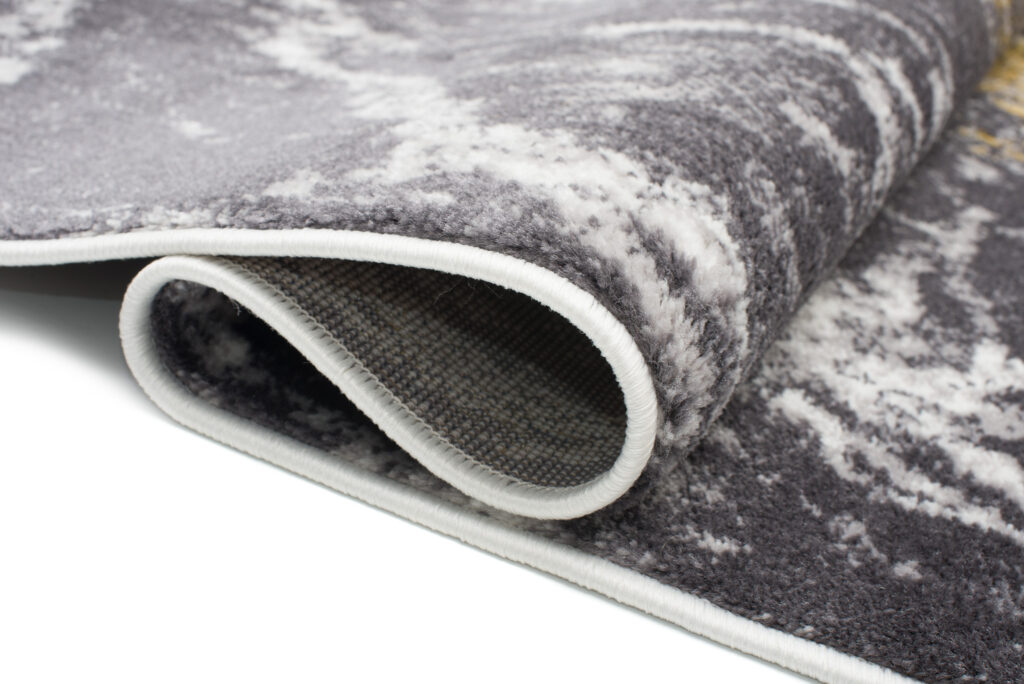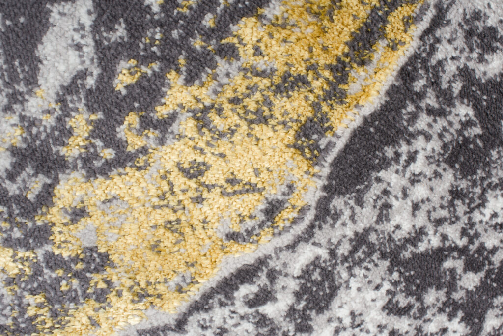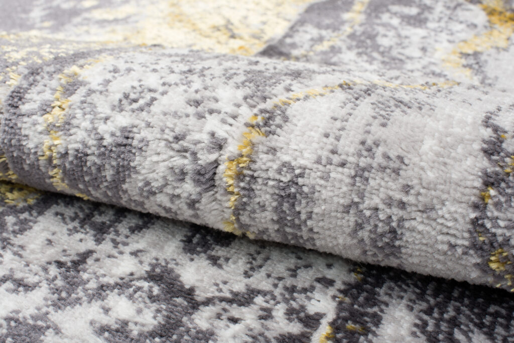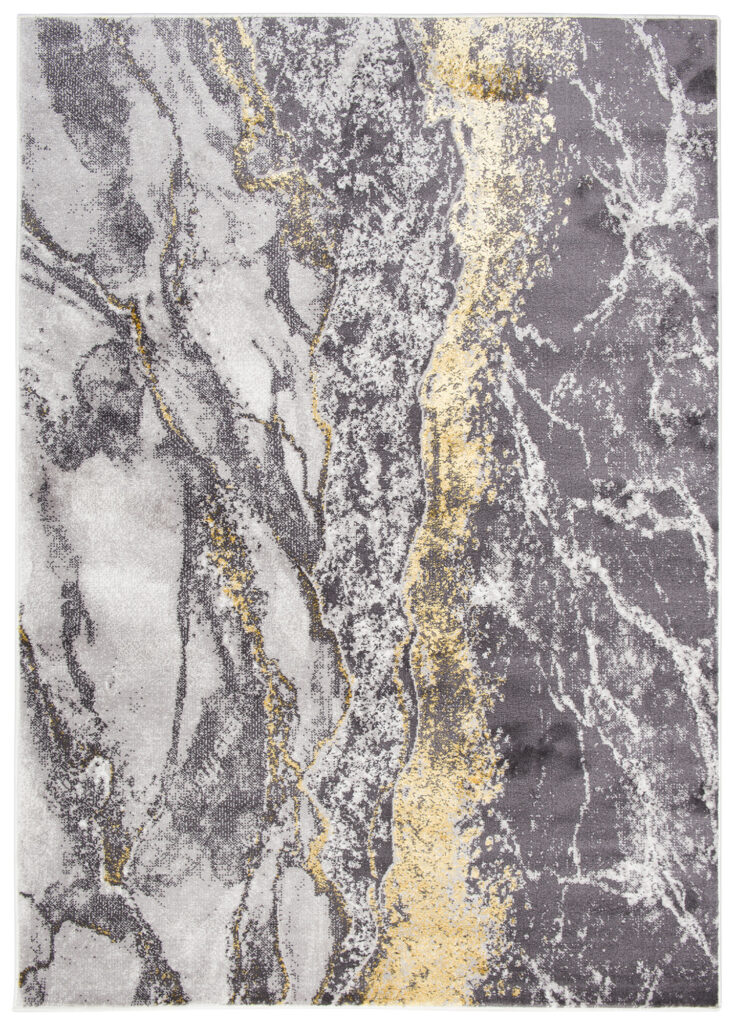 To, co wyróżnia tę kolekcję spośród innych, to abstrakcyjne wzory i subtelna złota nitka, która dodaje dywanom wyjątkowego blasku. Dominujące kolory kolekcji to głęboki szary, elegancki granatowy oraz luksusowy złoty, które harmonijnie łączą się ze sobą, tworząc przyciągający wzrok efekt wizualny.