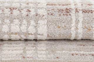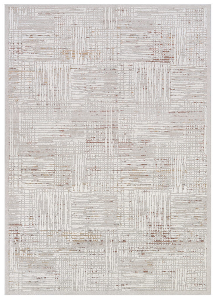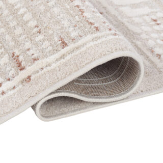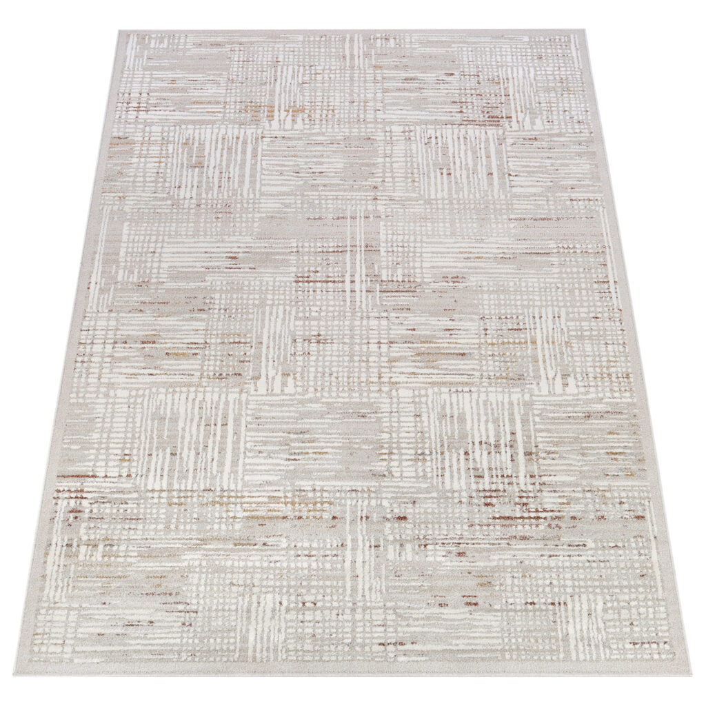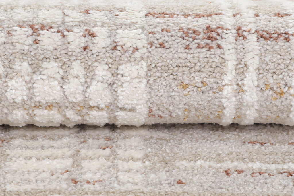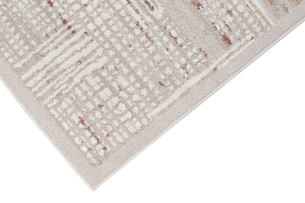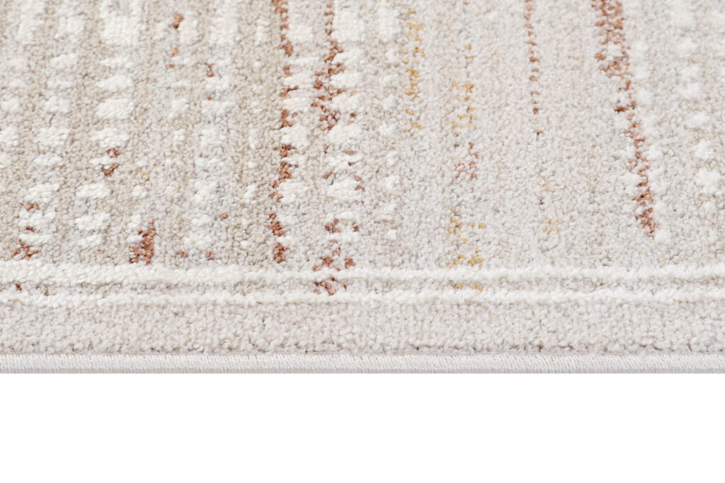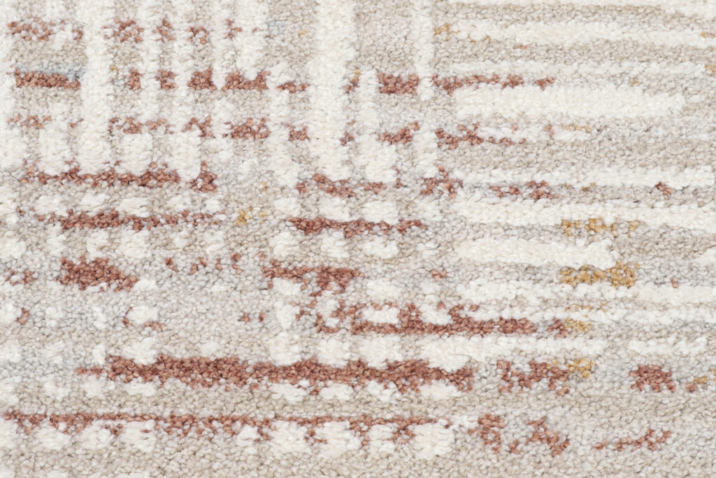 Styl i aranżacja: Dywan w nowoczesnym geometrycznym wzorze doskonale wpisze się w styl minimalistyczny, industrialny lub skandynawski. Jego neutralna kolorystyka – mieszanka bieli, beżu i delikatnych akcentów w odcieniach złota i czerwieni – świetnie komponuje się z wnętrzami urządzonymi w jasnych barwach, drewnianymi meblami oraz dodatkami w kolorze szarości, czerni lub pastelowych tonach.