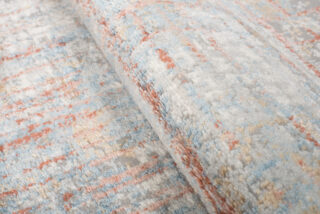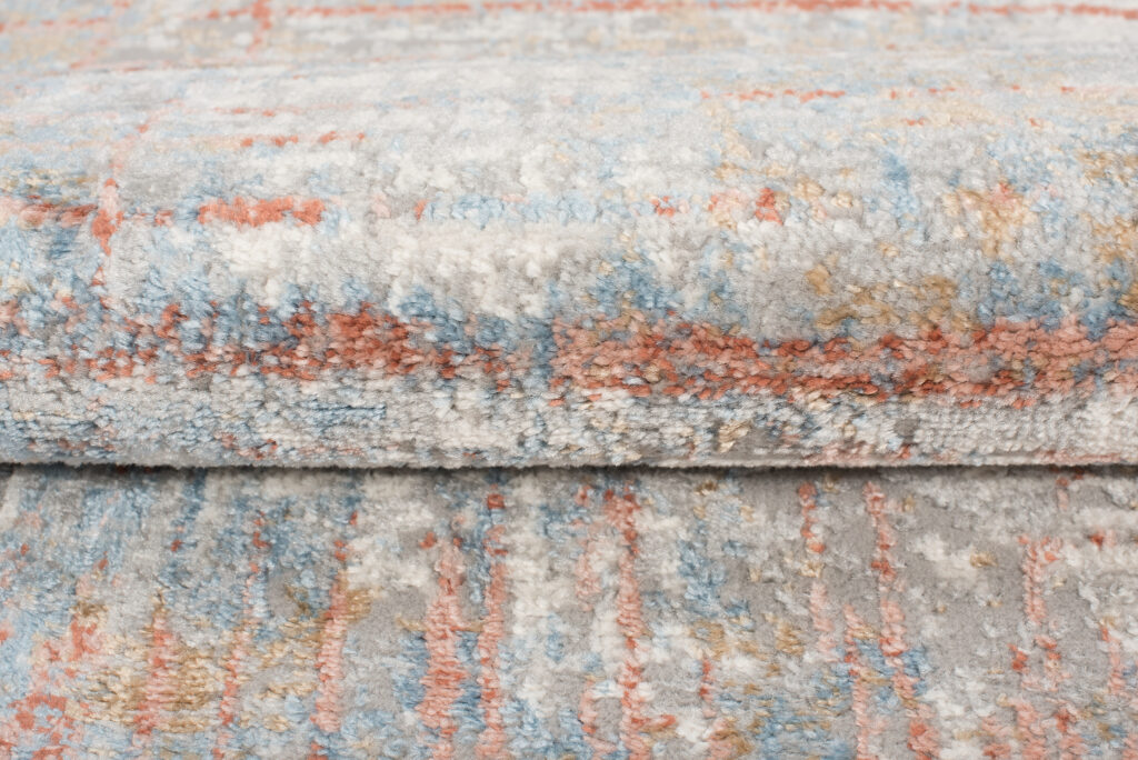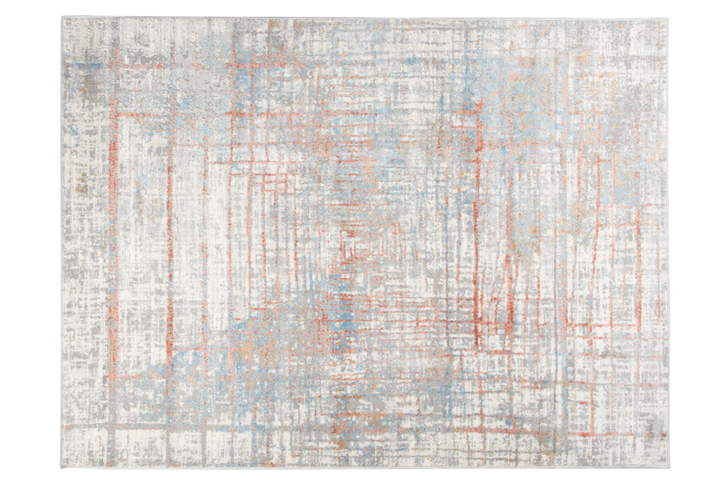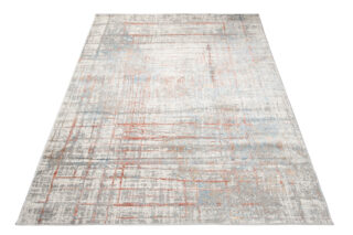 Nowoczesny dywan z kolekcji Valley z efektem postarzenia ma wyjątkową kolorystykę. Na jego białym tle mienią się barwy pomarańczowa, czerwona, jasnoszara i niebieska. Wzory są tak drobne i ulotne, że trudno je odróżnić od stylizowanych przetarć. Głównym motywem są tutaj cieniutkie linie, które w wielu miejscach krzyżują się rysując kwadraty i prostokąty. Na nich nałożona jest druga warstwa ornamentu w postaci szarych kreseczek. Kolor niebieski tworzy nieregularne plamy. Wzór zdaje się rozchodzić od środka na zewnątrz. Żadna z kresek nie jest jednolita, lecz złożona z punktów o różnej intensywności koloru. Linie i plamy przenikają się, dając wrażenie zużytego i wytartego dywanu.