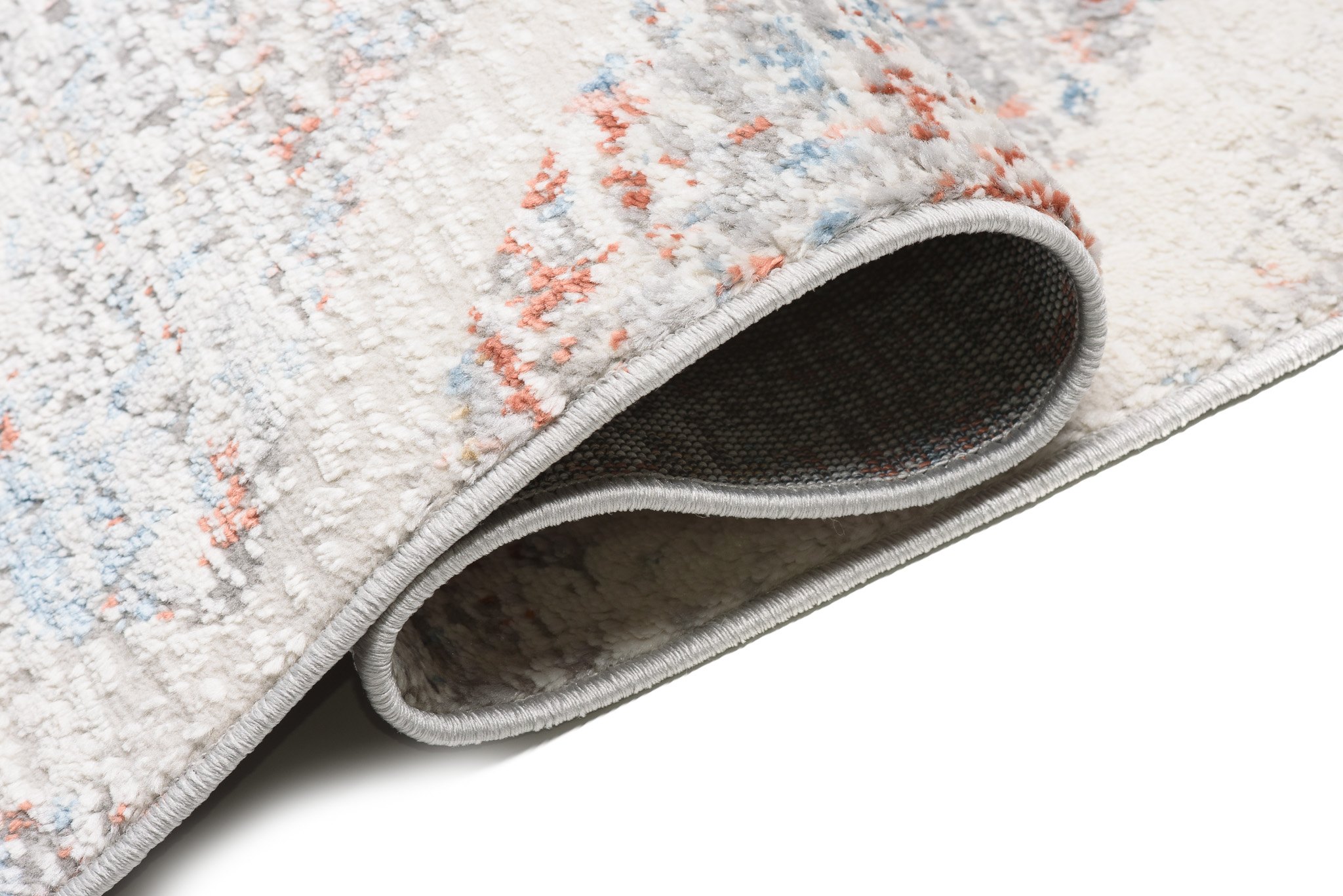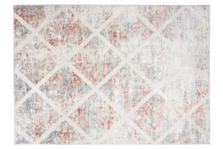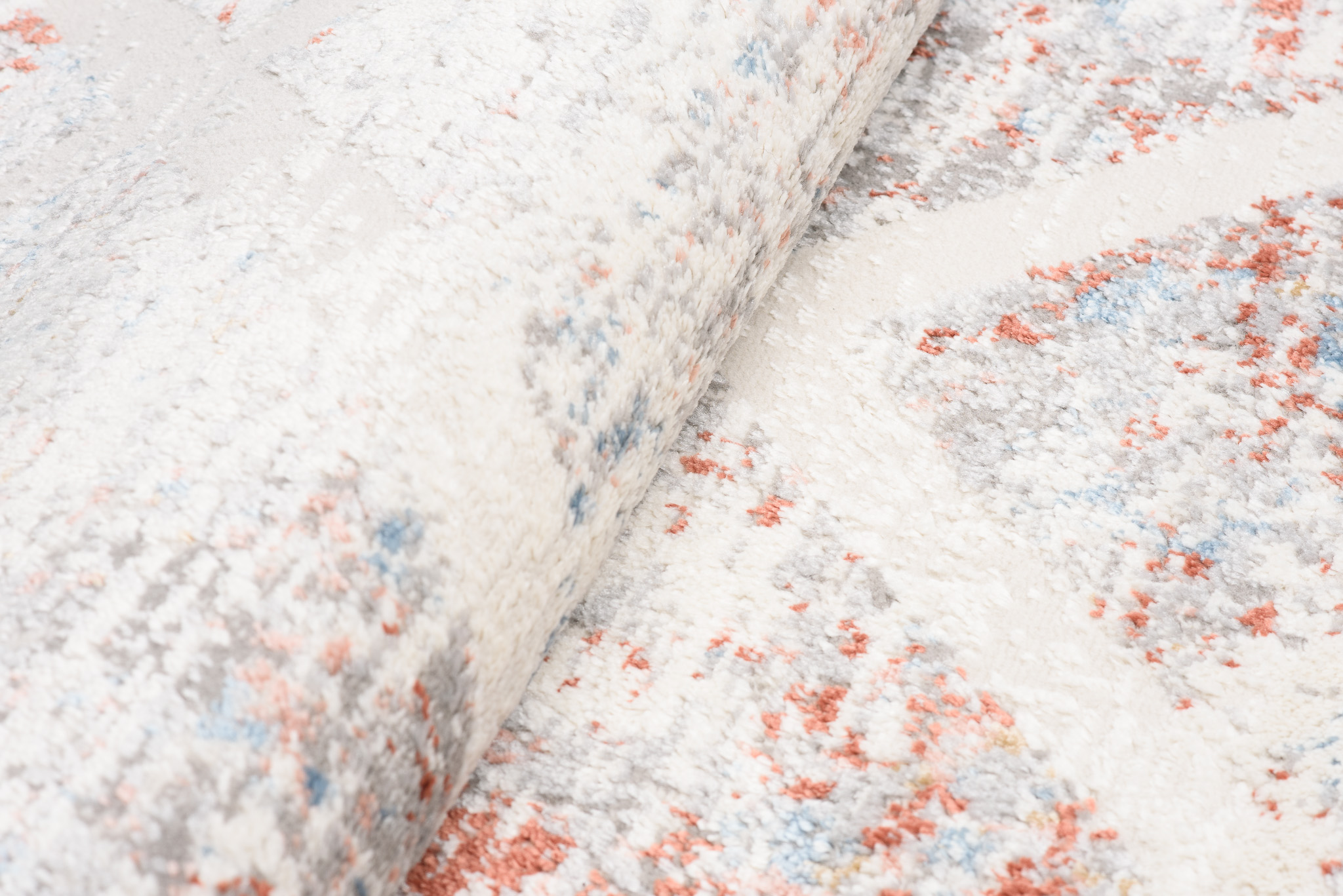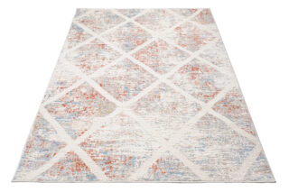 Jasny dywan z kolekcji Valley z geometrycznym wzorem i efektem postarzenia jest bardzo subtelny. Tworzą go skośne pasy, rysujące siatkę rombów na całej powierzchni. Pola pomiędzy nimi wypełnia abstrakcyjna kompozycja linearnie ułożonych drobnych punktów. Kolory i ich odcienie przenikają się i rozmywają. Pojawia się tutaj barwa jasnej szarości, pomarańczowa, łososiowa i błękitna. Rozłożone losowo nieregularne plamy bieli imitują przetarcia. Miejscami wzór jest ledwo widoczny lub całkowicie zanika. Kompozycja jest delikatna i nie dominuje we wnętrzu.