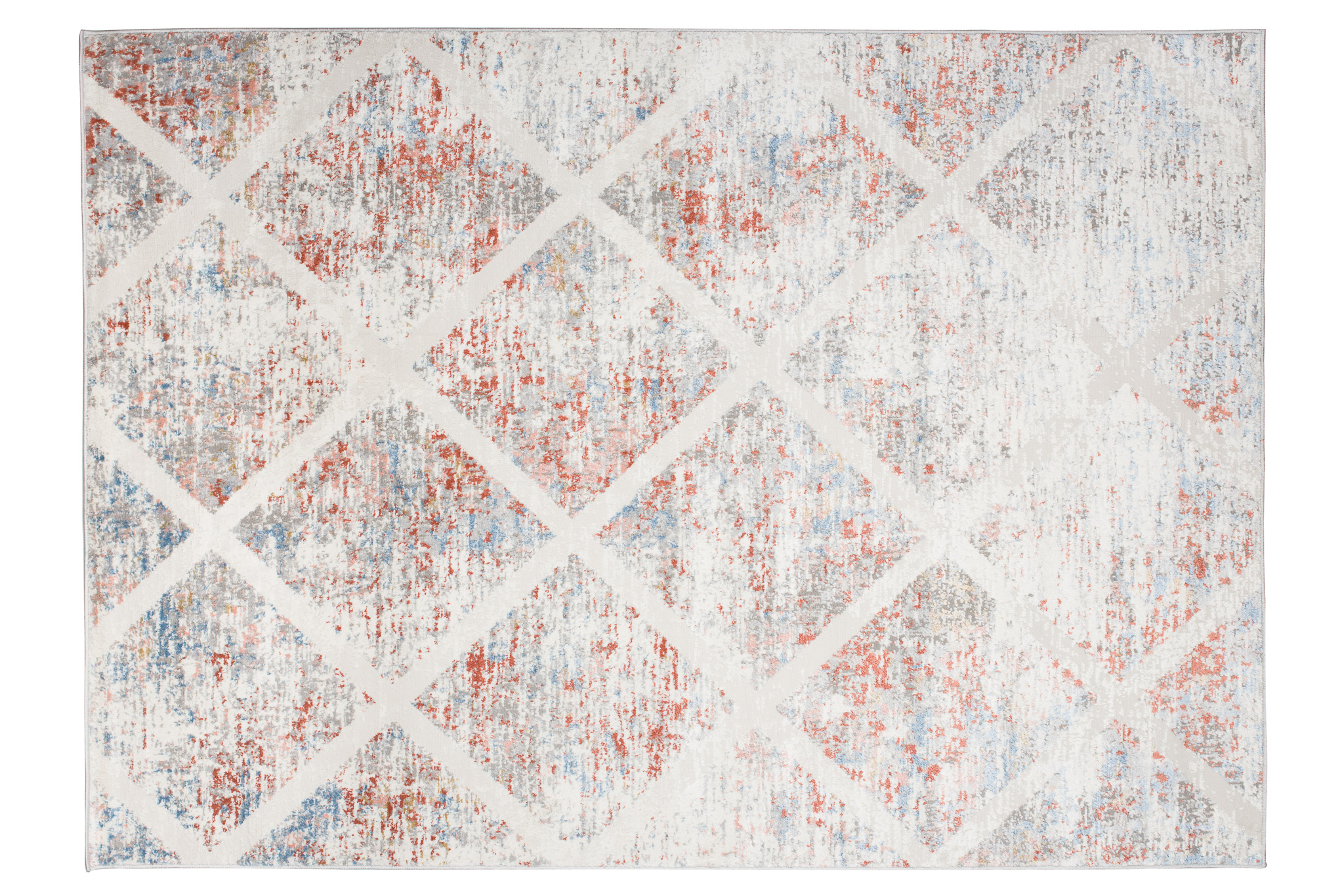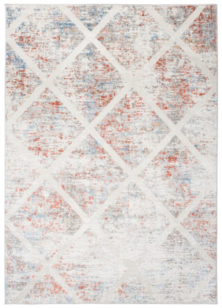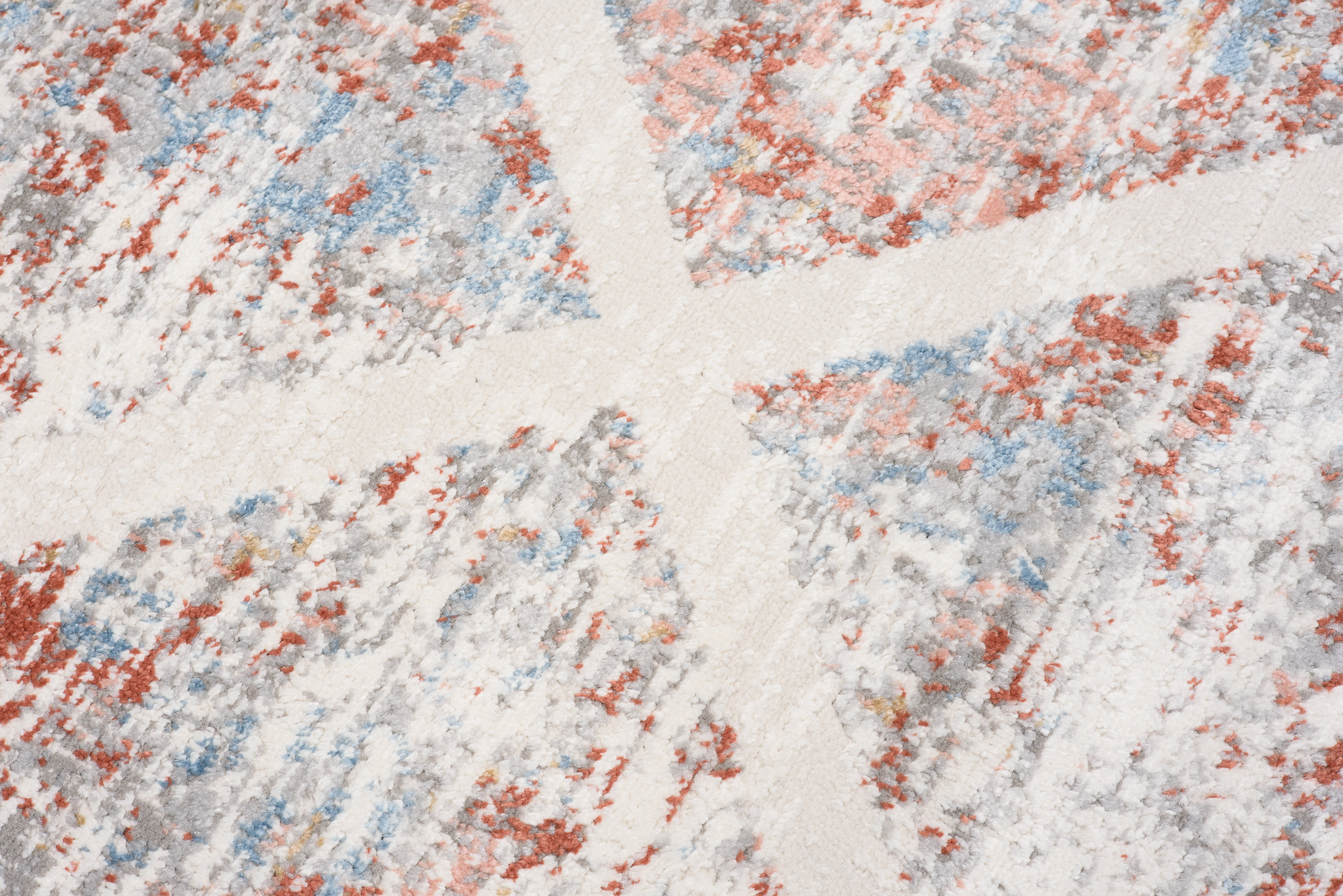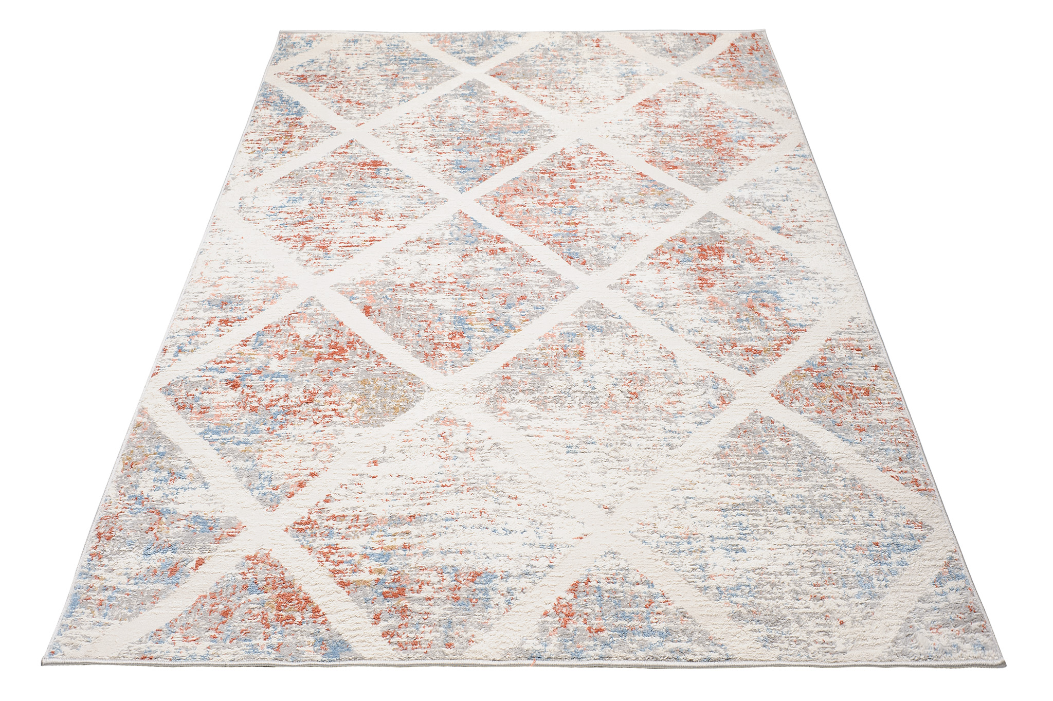 Jasny dywan z kolekcji Valley z geometrycznym wzorem i efektem postarzenia jest bardzo subtelny. Tworzą go skośne pasy, rysujące siatkę rombów na całej powierzchni. Pola pomiędzy nimi wypełnia abstrakcyjna kompozycja linearnie ułożonych drobnych punktów. Kolory i ich odcienie przenikają się i rozmywają. Pojawia się tutaj barwa jasnej szarości, pomarańczowa, łososiowa i błękitna. Rozłożone losowo nieregularne plamy bieli imitują przetarcia. Miejscami wzór jest ledwo widoczny lub całkowicie zanika. Kompozycja jest delikatna i nie dominuje we wnętrzu.