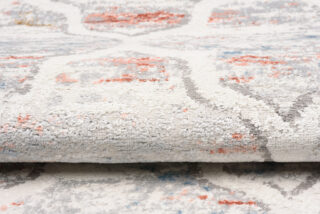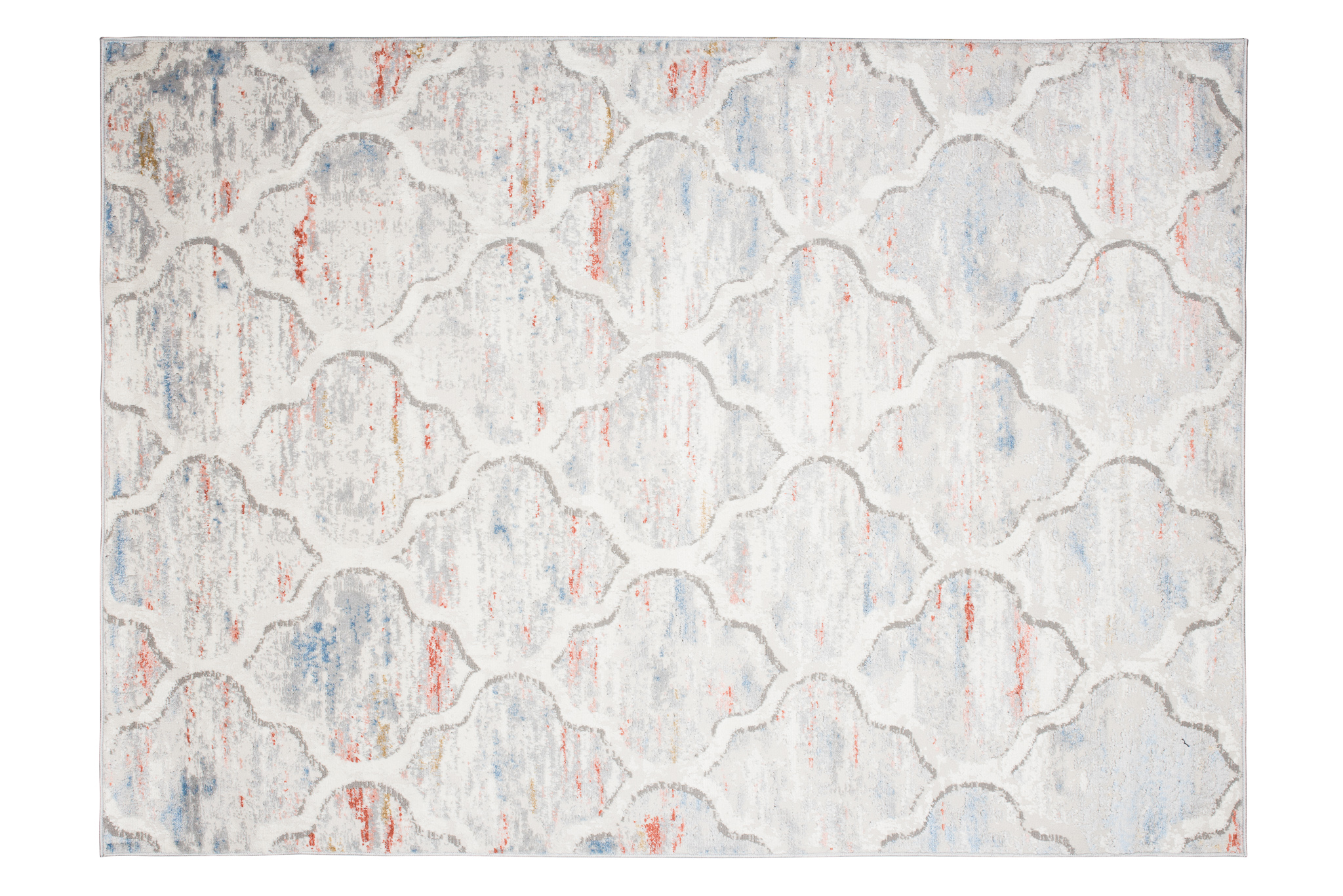 Prostokątny dywan ozdobiony jest wzorem marokańskiej koniczyny. Równolegle rozmieszczony motyw wykonany jest za pomocą białych linii. W niektórych miejscach pojawiają się tu delikatne szare cienie wywołujące efekt trójwymiarowości. Tło dywanu jest niejednolite kolorystycznie. Na jasnoszarej powierzchni można dostrzec wiele białych smug. Oprócz nich widoczne są też drobne czerwone i błękitne akcenty.