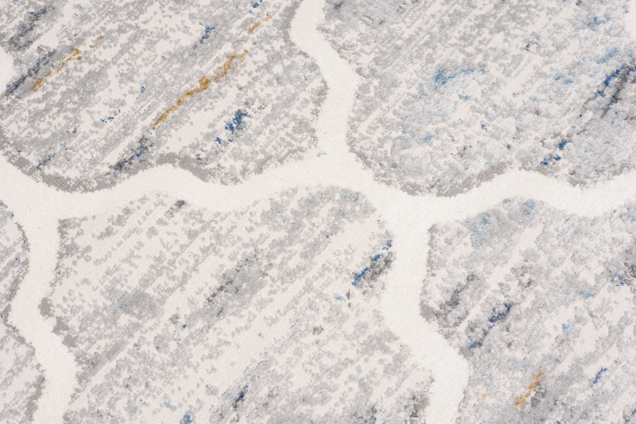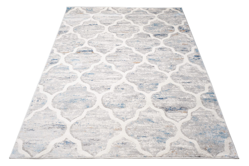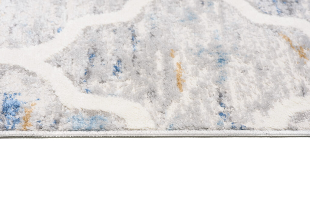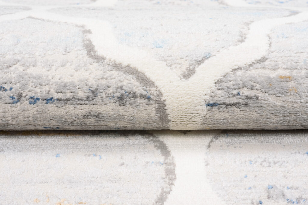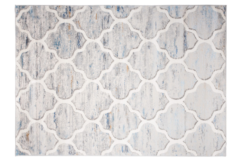Dywan z kolekcji Valley ma jasnoszare tło z drobnymi, barwnymi smugami. Na całej jego powierzchni można dostrzec subtelne „”przetarcia”” w kolorze błękitnym, niebieskim, jasnobrązowym i grafitowym. Na tle umieszczono wyraźną marokańską koniczynę. Białe linie tworzące wzór są dość grube. Przy ich skrajach można dostrzec też delikatne ciemnoszare cienie, które tworzą iluzję trójwymiarowości.