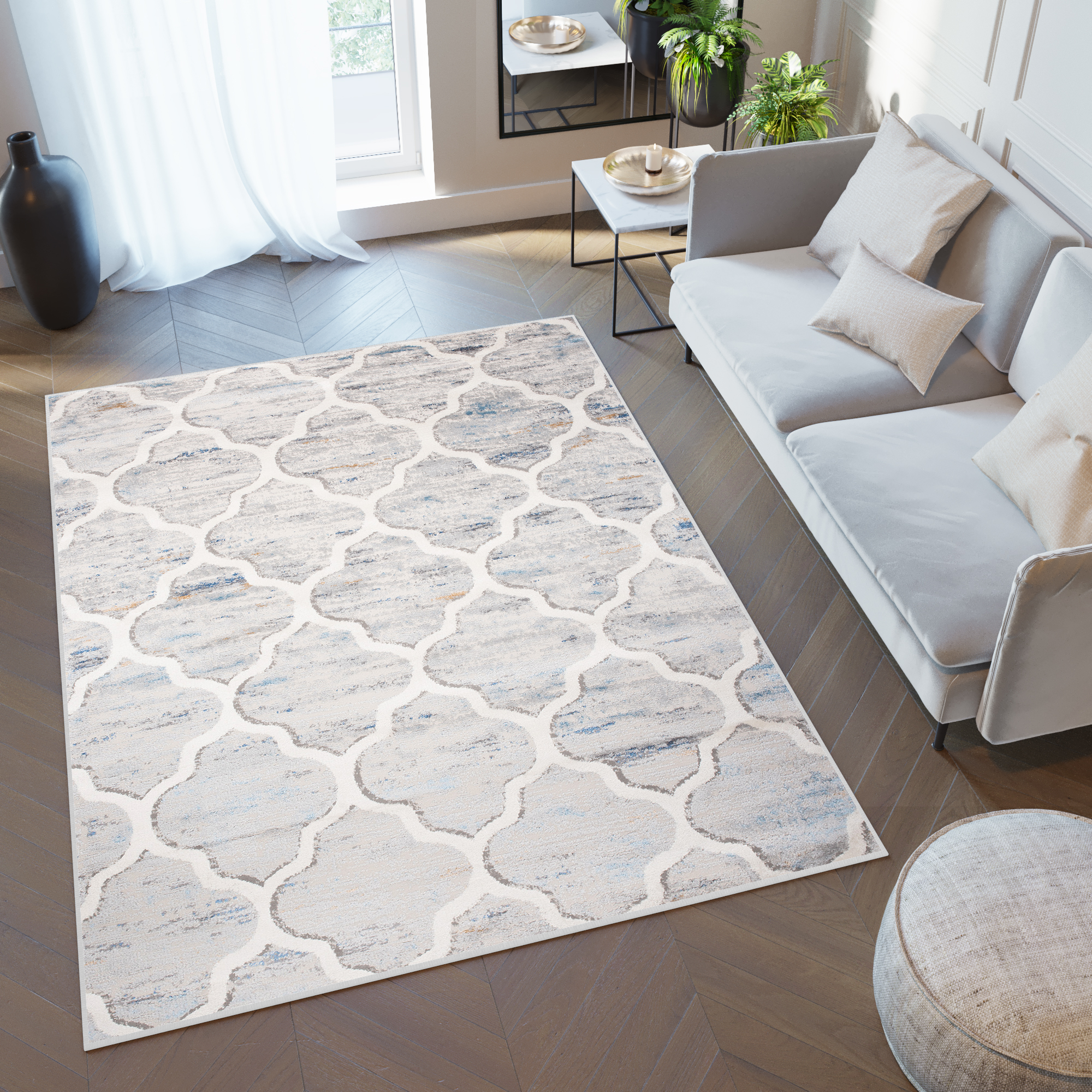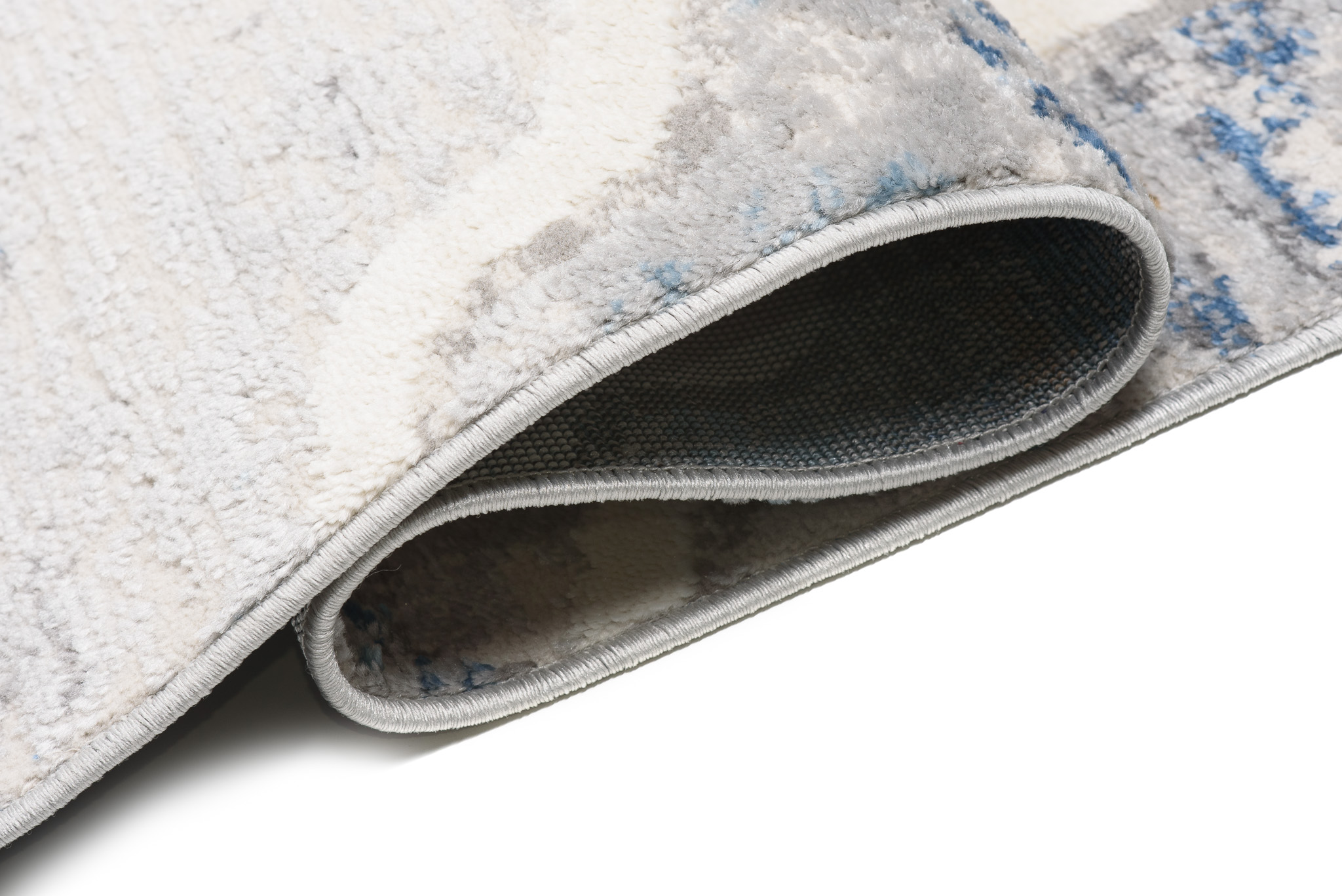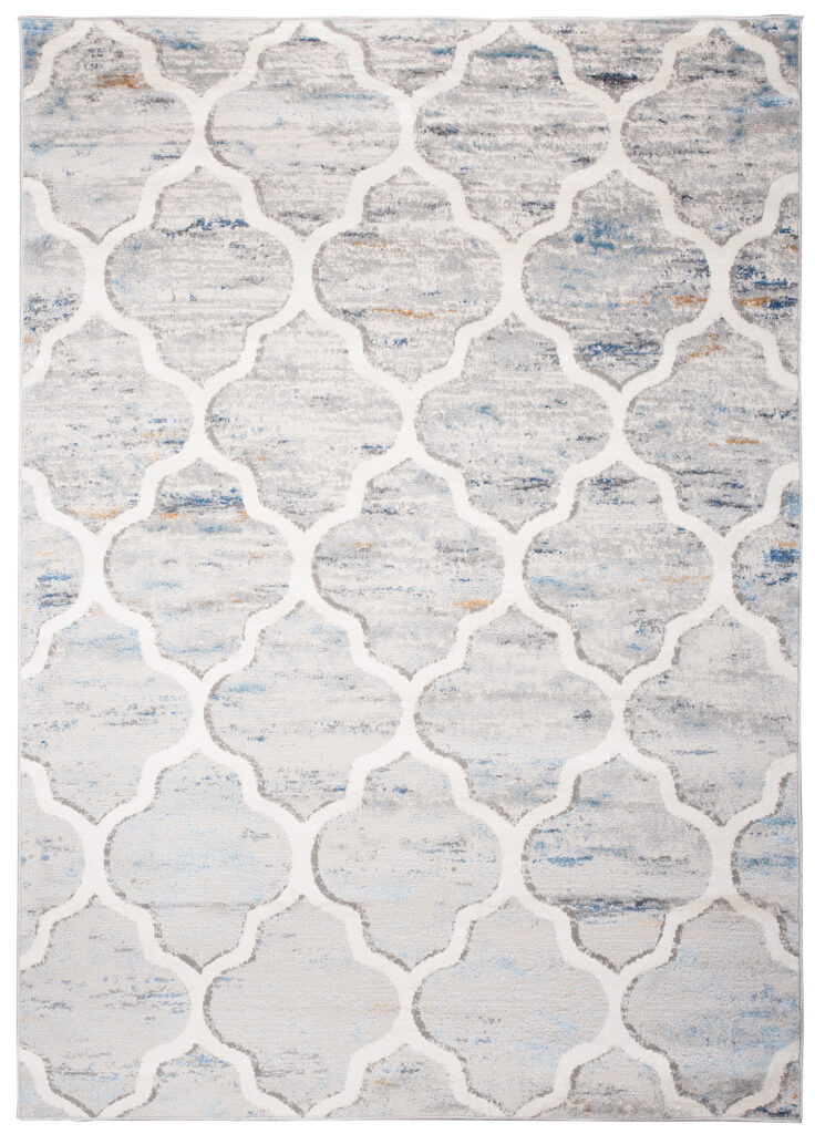 Dywan z kolekcji Valley ma jasnoszare tło z drobnymi, barwnymi smugami. Na całej jego powierzchni można dostrzec subtelne „”przetarcia”” w kolorze błękitnym, niebieskim, jasnobrązowym i grafitowym. Na tle umieszczono wyraźną marokańską koniczynę. Białe linie tworzące wzór są dość grube. Przy ich skrajach można dostrzec też delikatne ciemnoszare cienie, które tworzą iluzję trójwymiarowości.