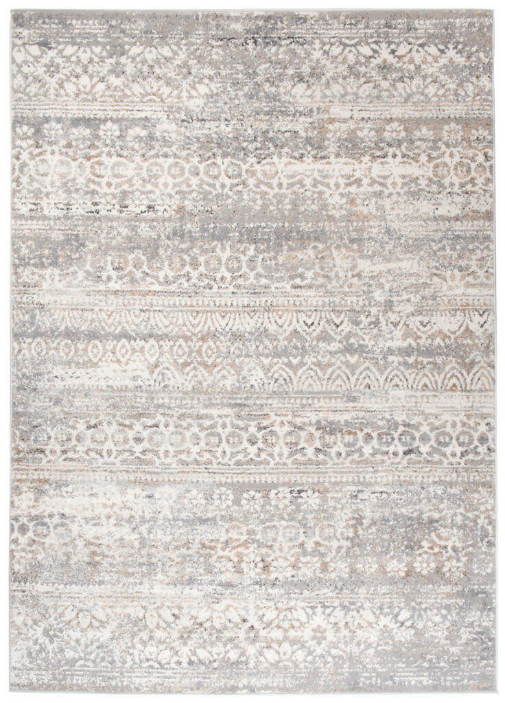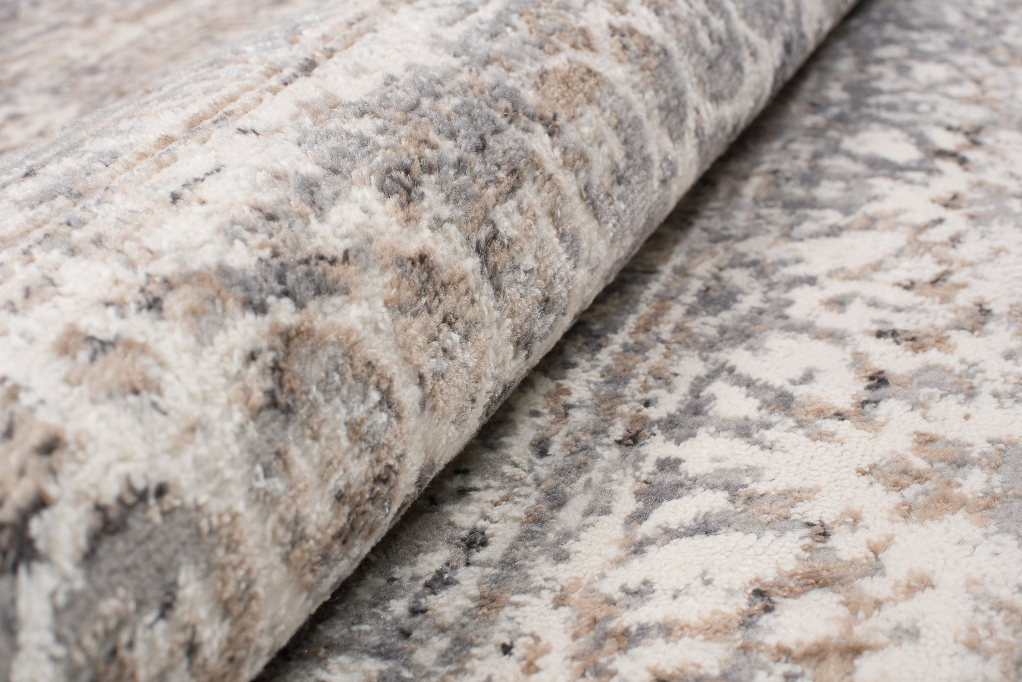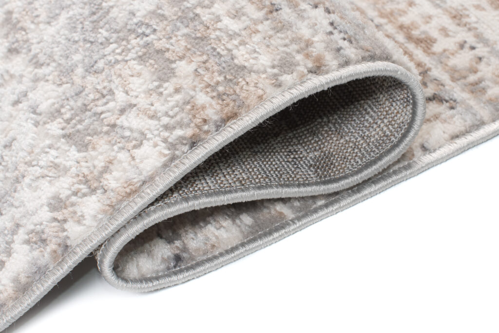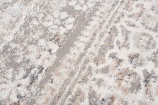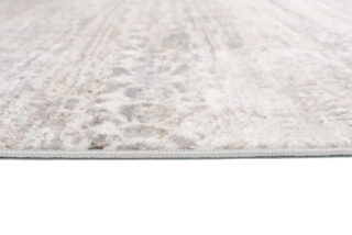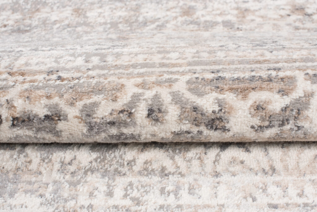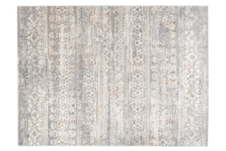 Prostokątny dywan z efektem postarzenia i tłem w nieregularne pasy. Powierzchnia utrzymana jest w różnych odcieniach szarości i delikatnego brązu. Można na niej dostrzec również niewielkie czarne plamki. Wzór przedstawia segmenty florystycznych motywów nawiązujących do orientalnej stylistyki. Kompozycja jest stonowana i przyjazna dla oka. Włosie dywanu jest lekko połyskliwe.